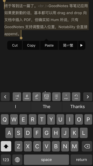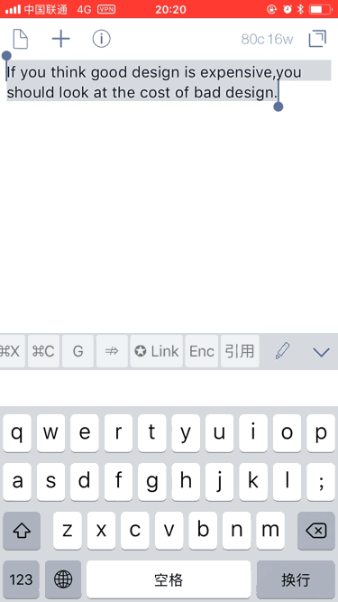 如果我们读一读各个应用的官方文档,不难发现它们已经为常用的变量和函数设置了专有名称,在 Drafts 的 字典 就很丰富: 我做了一个快捷键,可以以引用格式拷贝文字: