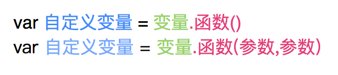 第一种比较简单,var 自定义了一个新变量(蓝色部分),它的名字可以随意取,甚至用中文也不要紧;等号右边是另一个变量(绿色部分)加上需要的函数(红色部分),注意函数名后面需要加上一对英文括号 ()。变量.函数() 表示用该函数处理该变量,整行的作用是把处理完的值赋予我们设置的自定义变量。