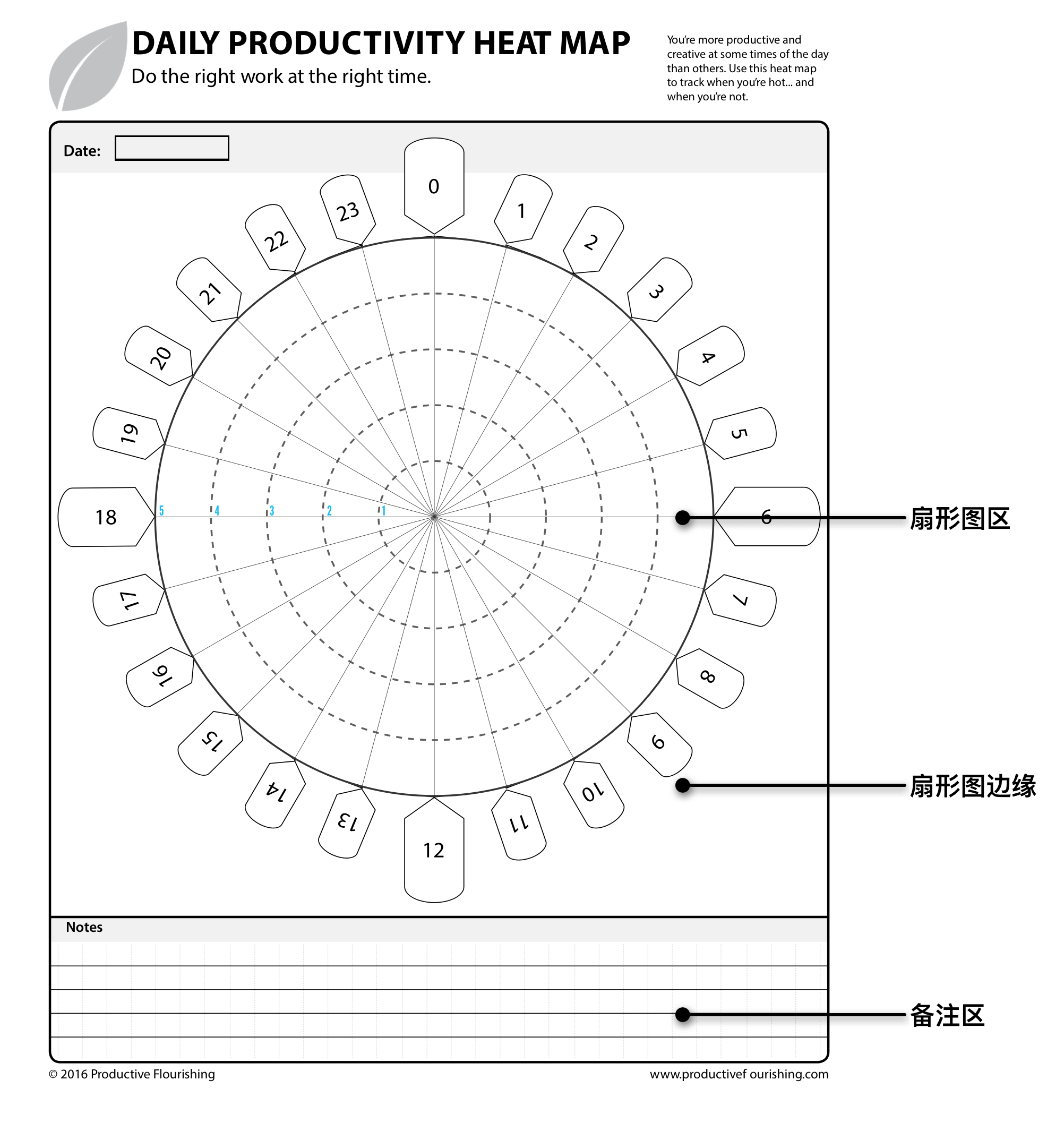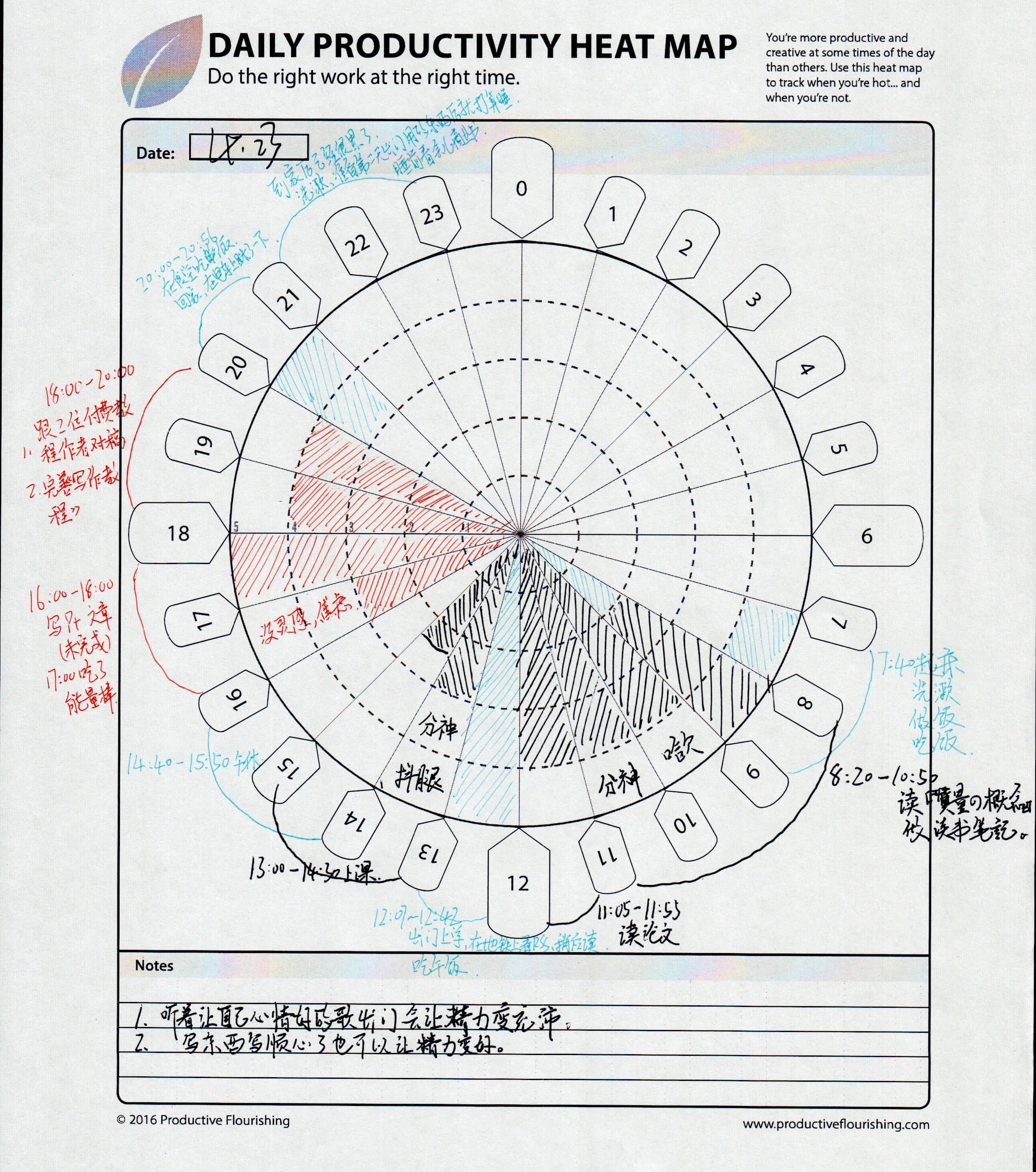 扇形图区是最主要的区,为了记录不同情况下的精力使用情况,我们需要用到不同的颜色。它可以让我们对自己的状态一目了然,甚至轻松地为自己一天的生产力打分。
