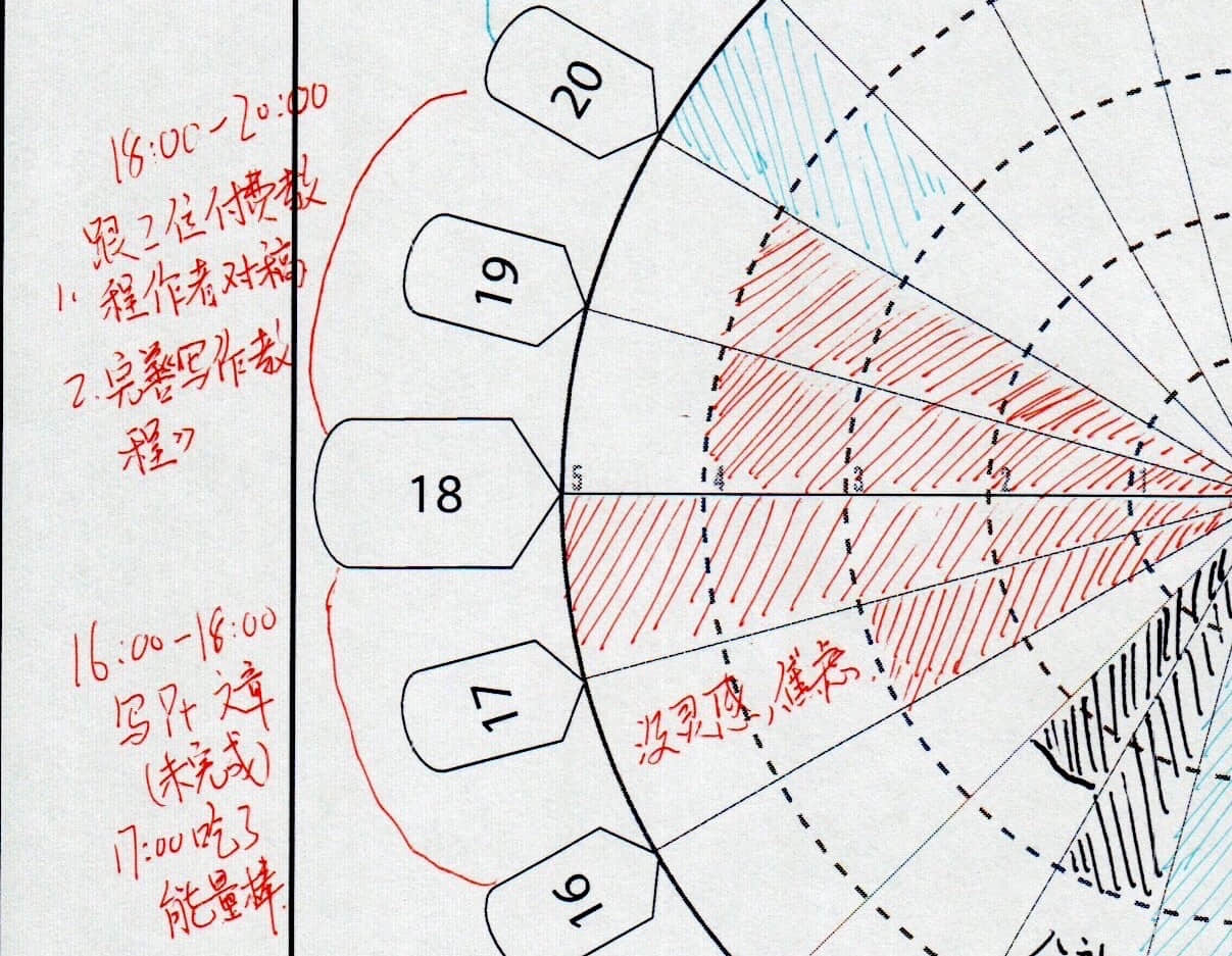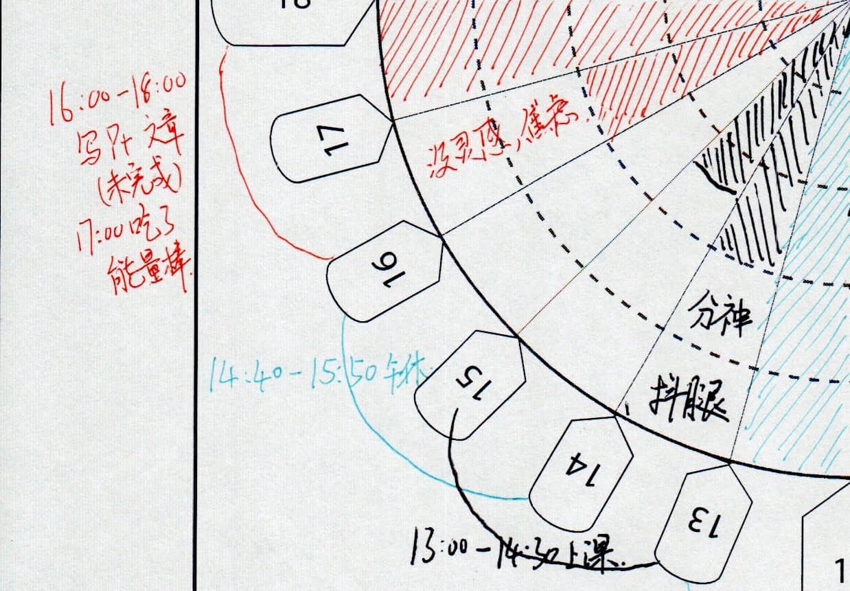 为了弥补这种错位,我们可以在表示精力的扇形图旁边记下来「什么时候干了什么」。