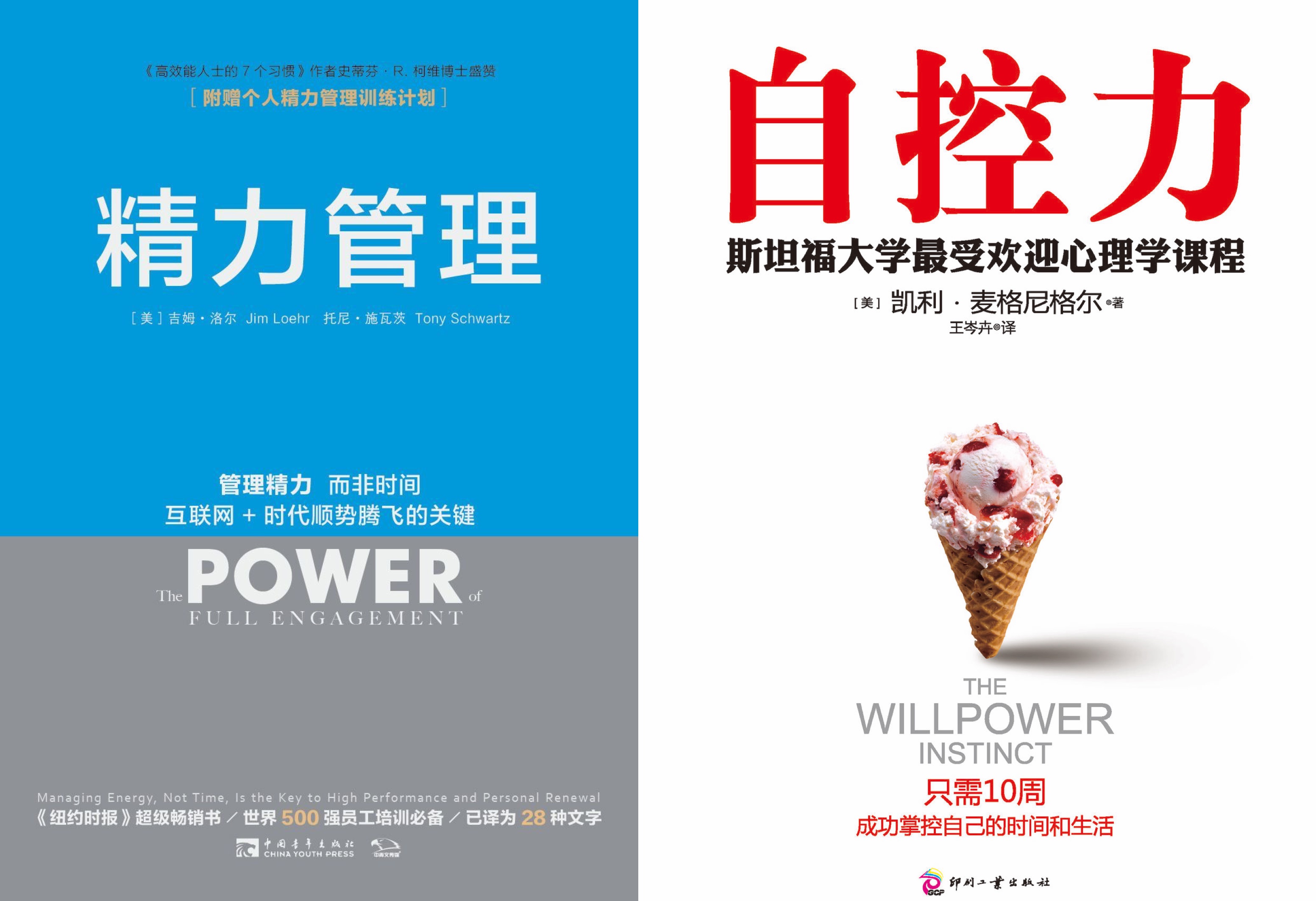 看到这的话,相信你已经可以看得出来我要推荐的两本书分别是《精力管理》和《自控力》。 《精力管理》里把精力的来源分为了 4 个部分,每个人欠缺的地方不同,有的人欠缺一点,有的人四点全部欠缺。它的作者是 The Energy Project 公司的总裁 Tony Schwartz 和心理学家 Jim Loehr,Tony 与企业合作多、Jim 与运动员合作多,因此书中含有大量实例。