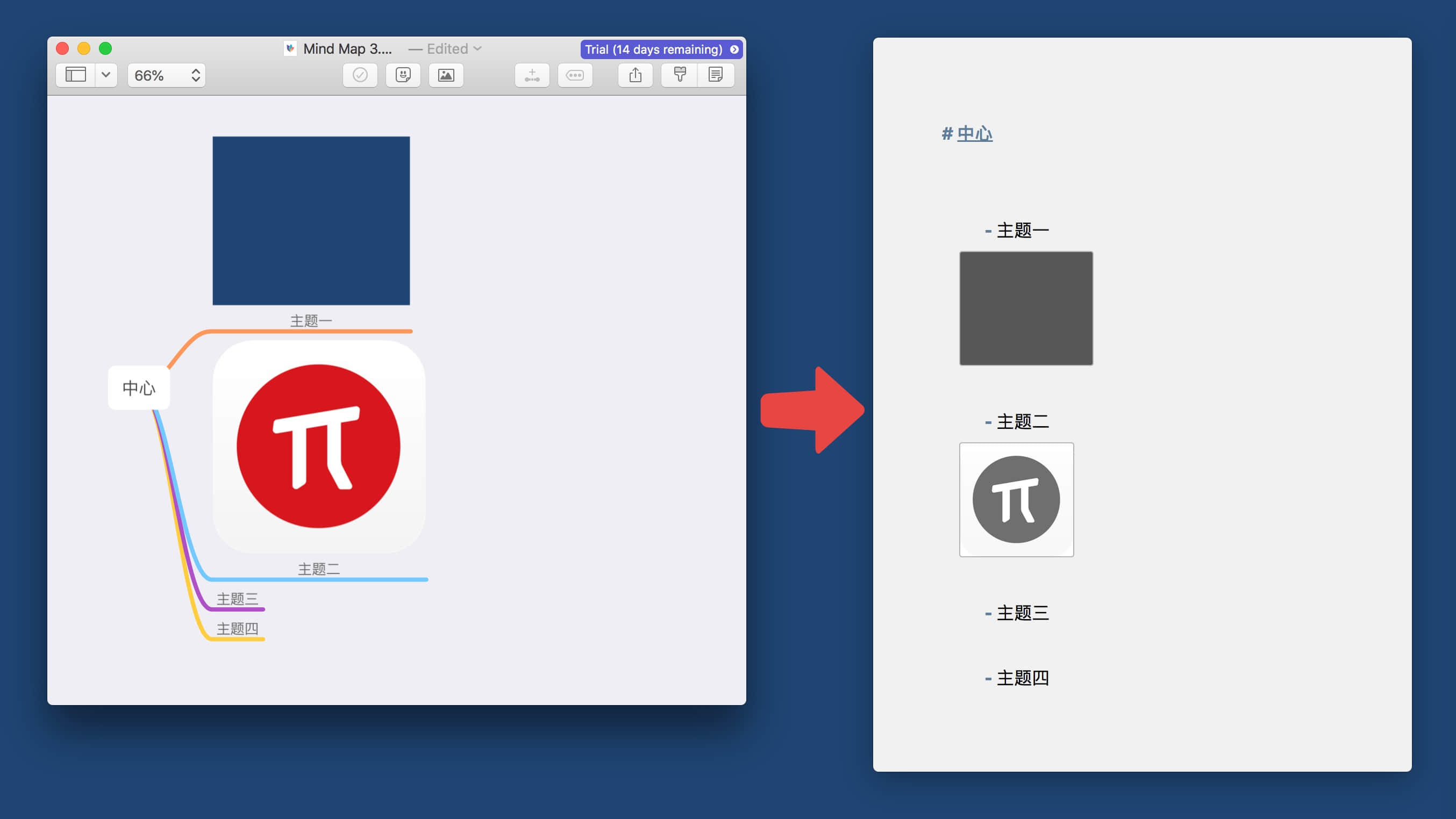 但 MindNode 和 iThoughts 这两款工具,则支持直接导出为 TextBundle 格式,用 Markdown 编辑器打开后,可以直接看到图片已经内嵌在文章中。