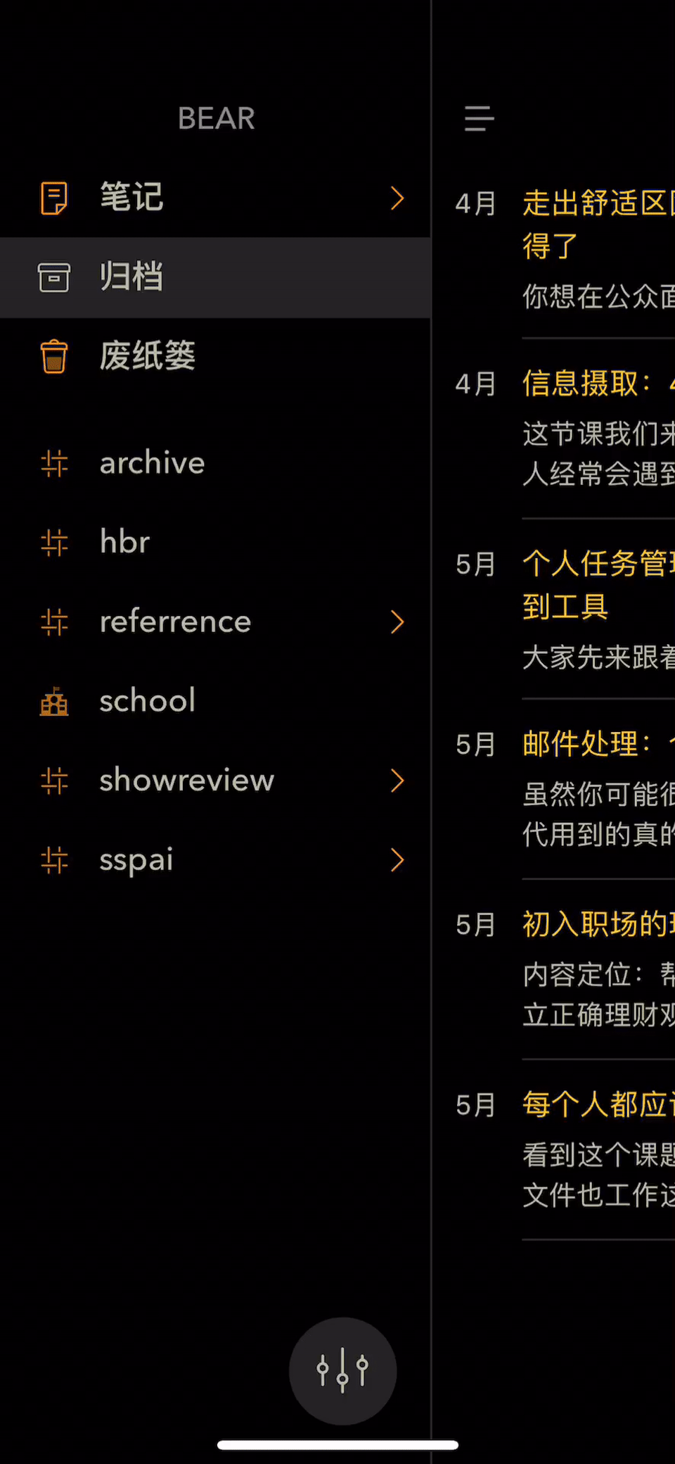 在 1.5 版中,Bear 增加了「归档」,并且将它和一些特殊的文档形式(比如「未添加标签」、「待办事项」、「今天」)放到了侧边栏: