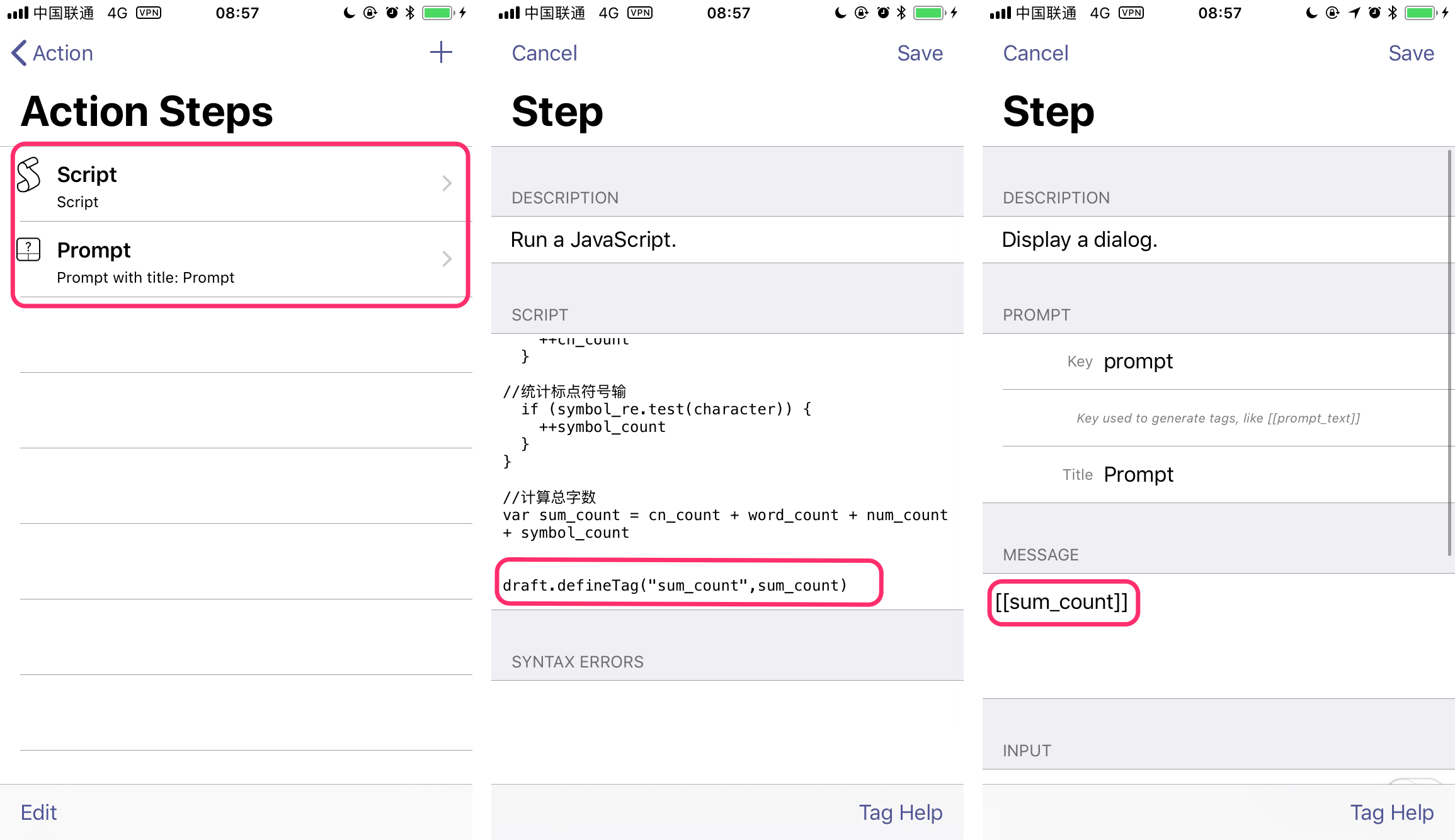 其中统计字数的部分,只要懂了 Automator 版本的代码,套用起来就轻车熟路;而「定义标签」则用到了 Drafts 的专有语法: