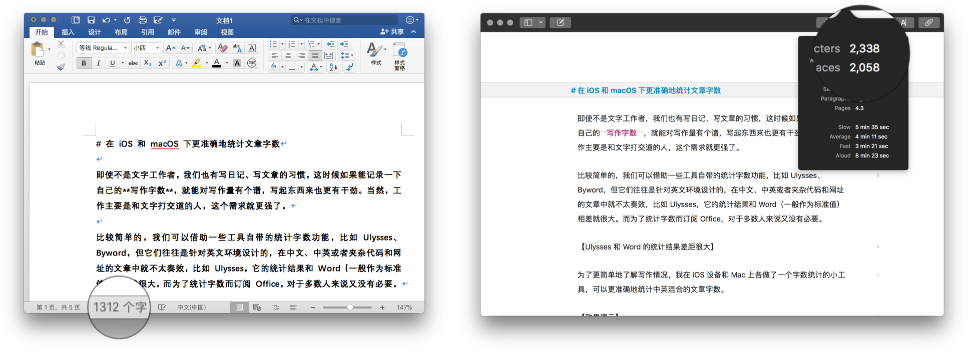 统计字数的功能 Word 做的是最靠谱的,也是普遍的参考标准。但是,大多数愿意使用 Markdown 的人们正是对 Word 有着各种不满才使用了轻量的标记语言。单纯为了查字数去买 Word、或者任何一个编辑器,都会有牛鼎烹鸡之感。