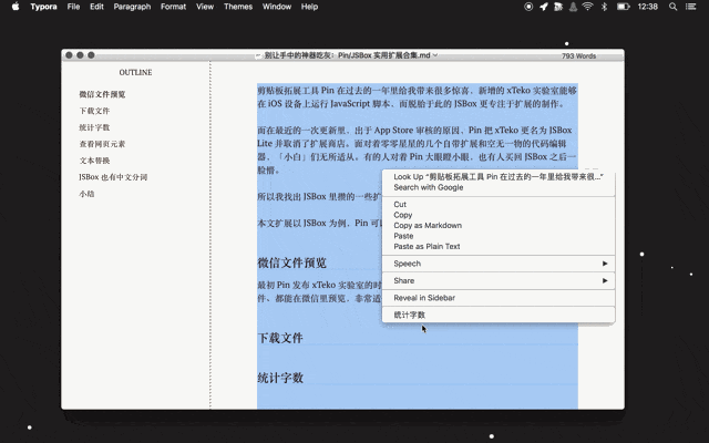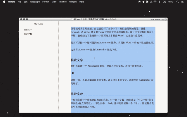 现在把 Automator 服务保存起来,在任意一个应用里选中一块文字,运行一下这个服务试试: