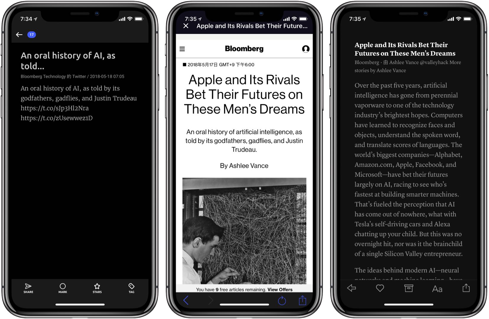 通过 RSSHub 这个服务,我们可以非常简单地为任何一个 Twitter 用户生成一个 RSS 链接,比如 Bloomberg 的 Technology 新闻,它的 Twitter 帐号是:@technology(我也觉得这个 ID 很 diao。),那么它的 RSS 链接就是:https://rsshub.app/twitter/user/technology。 我会通过 RSS 扫 Bloomberg Technology 中我感兴趣的新闻,如果想细看,就会打开 Twitter 的链接保存到稍后读(Instapaper 抓 Bloomberg 的效果更好一些)。