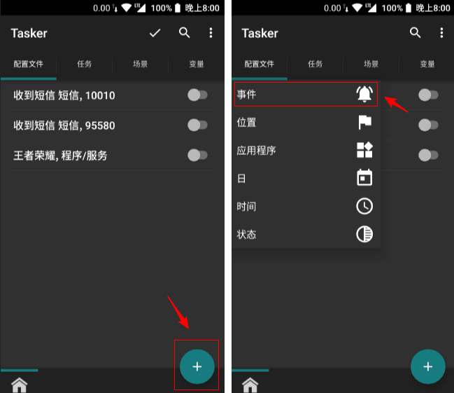 在 Tasker 的配置文件界面点击右下角的「+」号,选择事件。