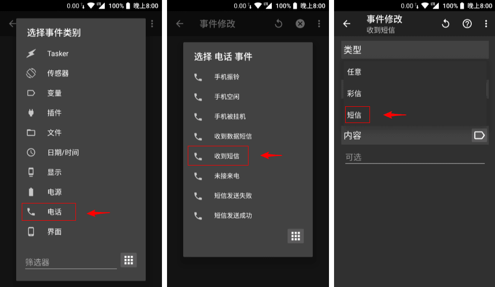 首先我们要让 Tasker 收到短信时触发任务,也就是确定「发生什么」。