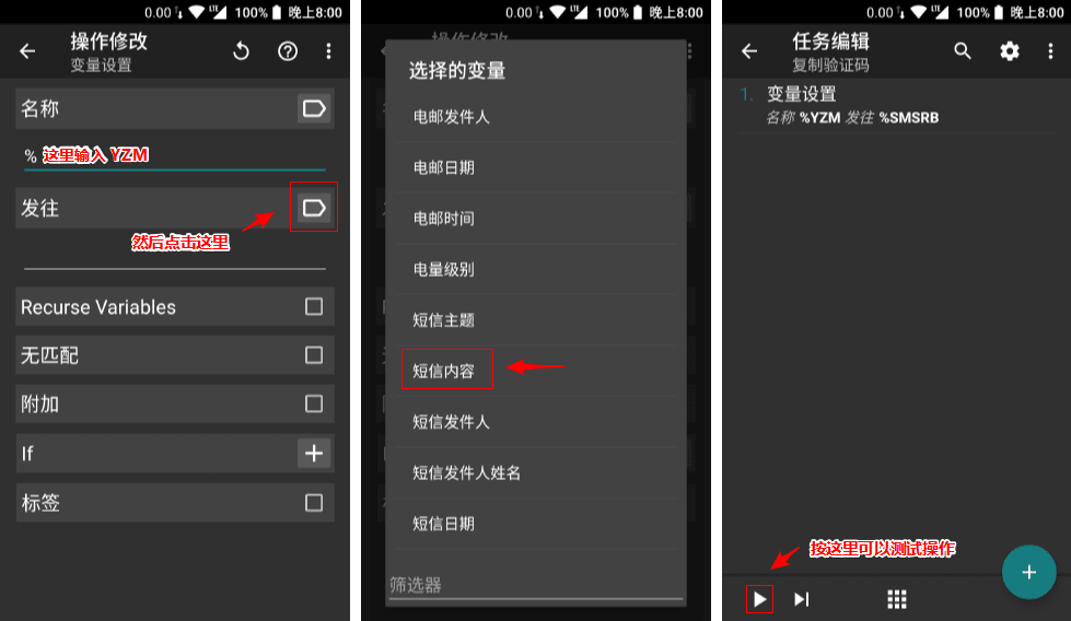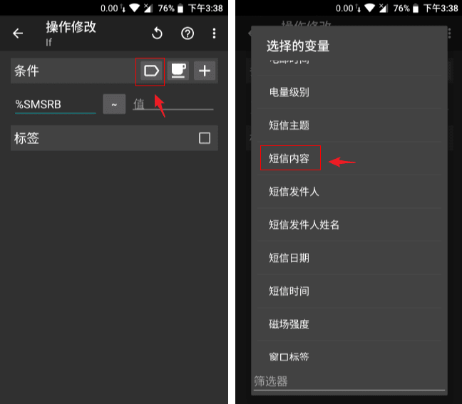 变量选择界面里的「短信内容」本身就就是一个名为「%SMSRB」,储存着短信内容的变量。