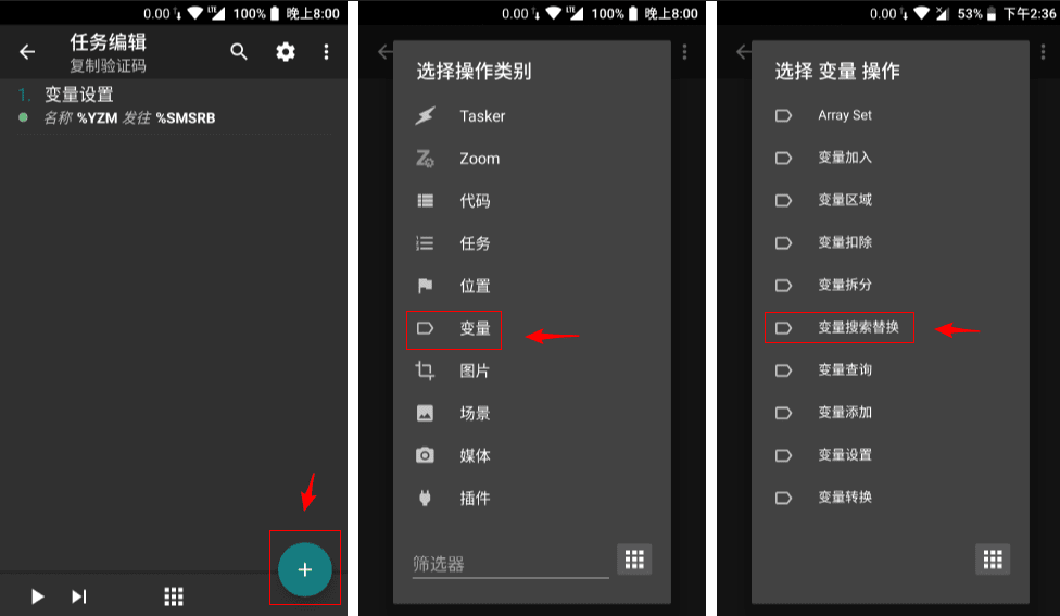 任务编辑界面点击右下角的「+」号,选择变量 → 变量搜索替换。
