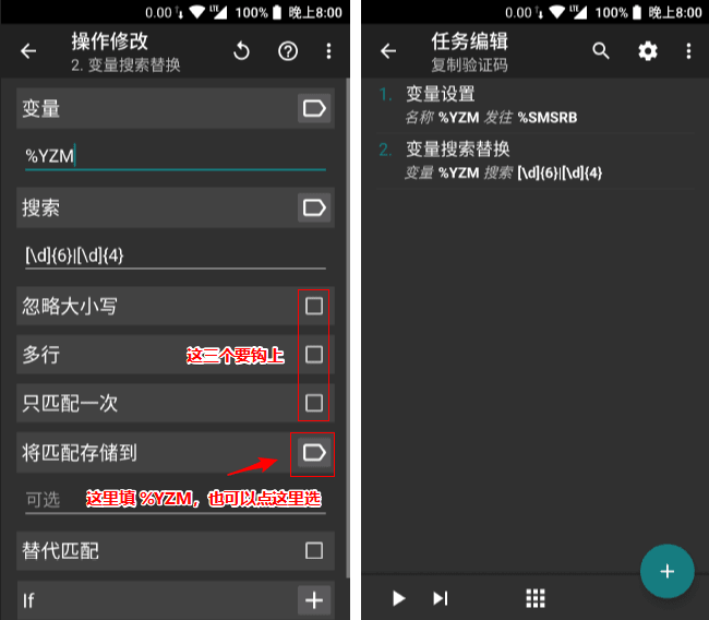 在操作编辑界面,变量填写 %YZM ,搜索填入 [\d]{6}|[\d]{4} (这里是匹配 4 个或者 6 个数字的正则表达式),把忽略大小写,多行,只匹配一次都勾选上。然后将匹配储存到填入%YZM 即可。
