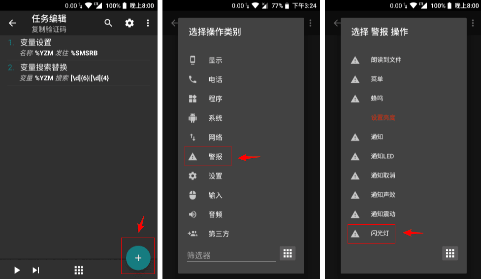 点击右下角的「+」号,选择警报 → 闪光灯。
