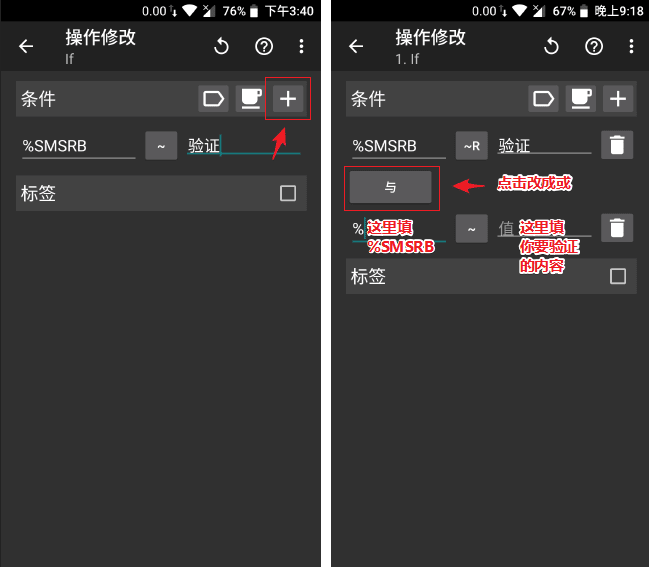 添加 if 判断之后,只有短信内容里面带有「验证」两个字才会被当成验证码短信啦。你还可以根据自己的实际情况添加更多的判断来提高精准度,比如英语「code」或者「登录码」之类的。在操作编辑界面弄好一个判断之后点击条件右边的「+」号图标,然后把「与」改成「或」就能添加新的判断了。