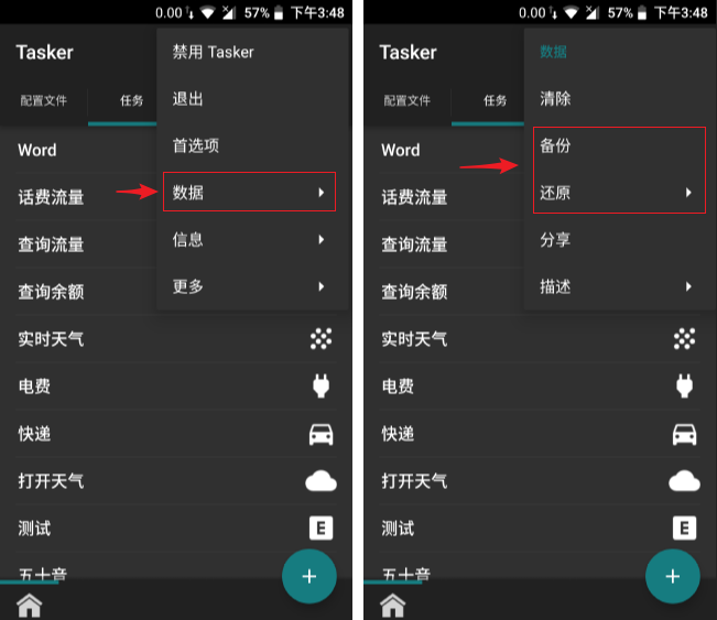 首先使用 Tasker 选项里面的数据 → 备份可以备份所有配置和任务;数据 → 还原 → 手工备份选择 xml 文件可以还原所有配置和任务,不过这种方法会覆盖所有原有的数据。也就是说这个只能用于刚安装 Tasker 时还原之前的数据。