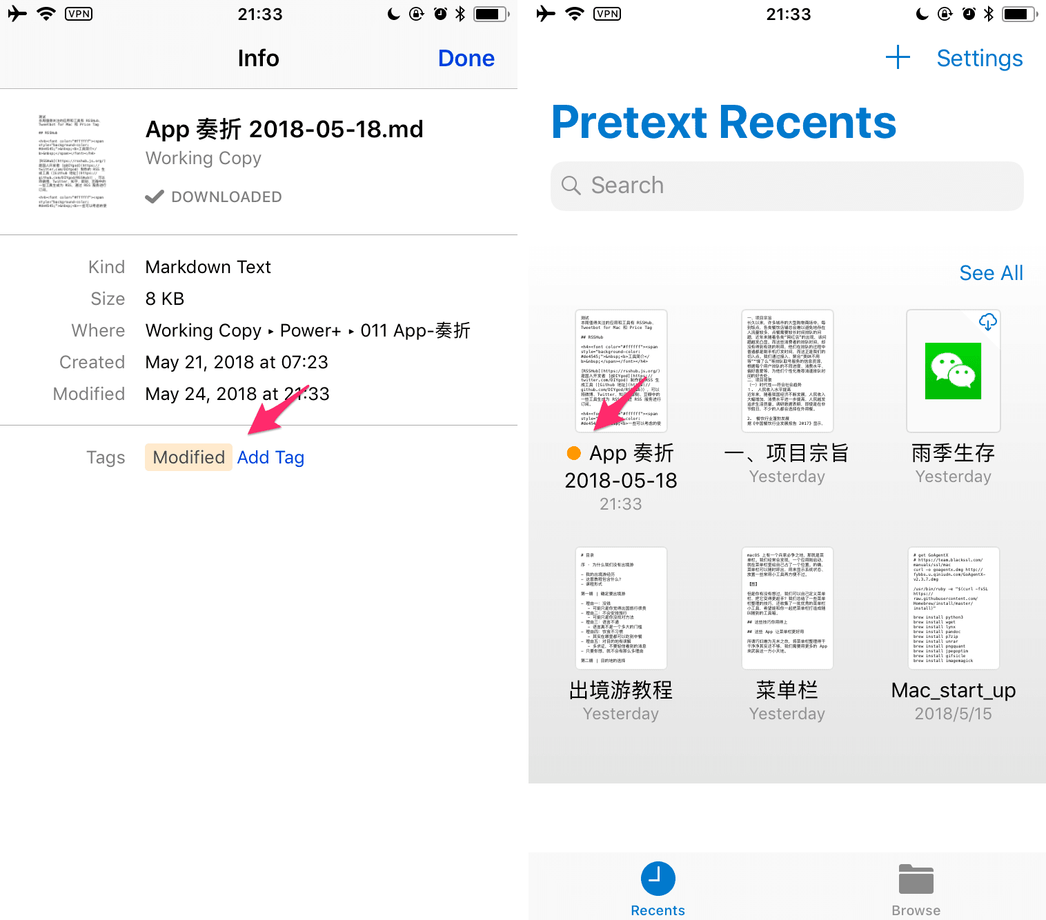 而 Working Copy 这次的更新还用上了 File Provider 的另一个特性:标签。所有有过修改但是还没提交(Commit)的文件,都会被标上黄色的 Modified 标签(和 Working Copy 应用内表示已修改过动文件用了一样的颜色),这样不用进入 Working Copy 就能知道有没有修改需要提交,而不用打开应用查看;如果你用其他支持 File Provider 来编辑文档(比如 Pretext),改完在应用内就能看到 Working Copy 文件夹里的黄色待提交标签,颇为显眼。