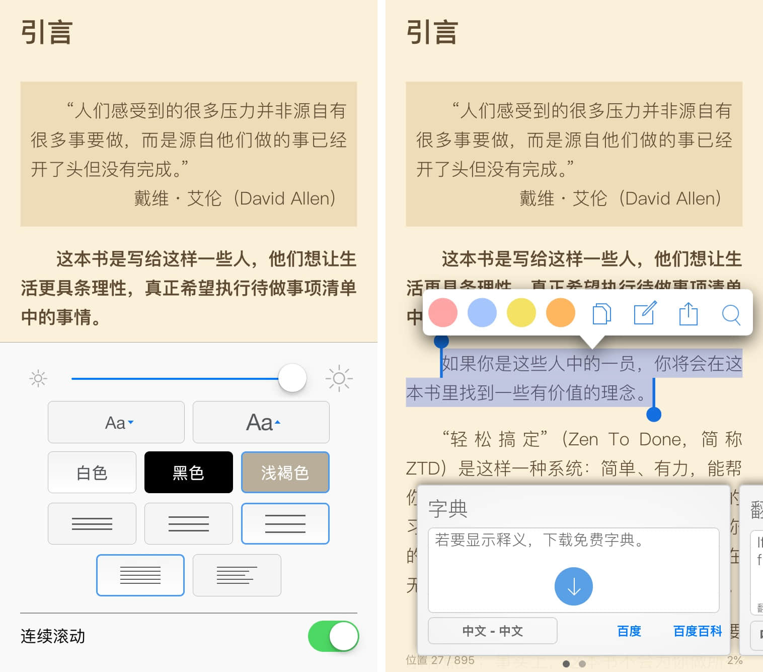 苹果自家的 iBooks 应用一直都支持连续滚动,但无奈国区 iBooks Store 停止运营了。Kindle for iOS 后来也只支持了连续滚动,但却不支持在连续滚动模式下选中文字,也就导致无法进行复制、查词和高亮等操作。最新一版终于修复了这个问题,推荐大家可以试一试连续滚动这种阅读模式。