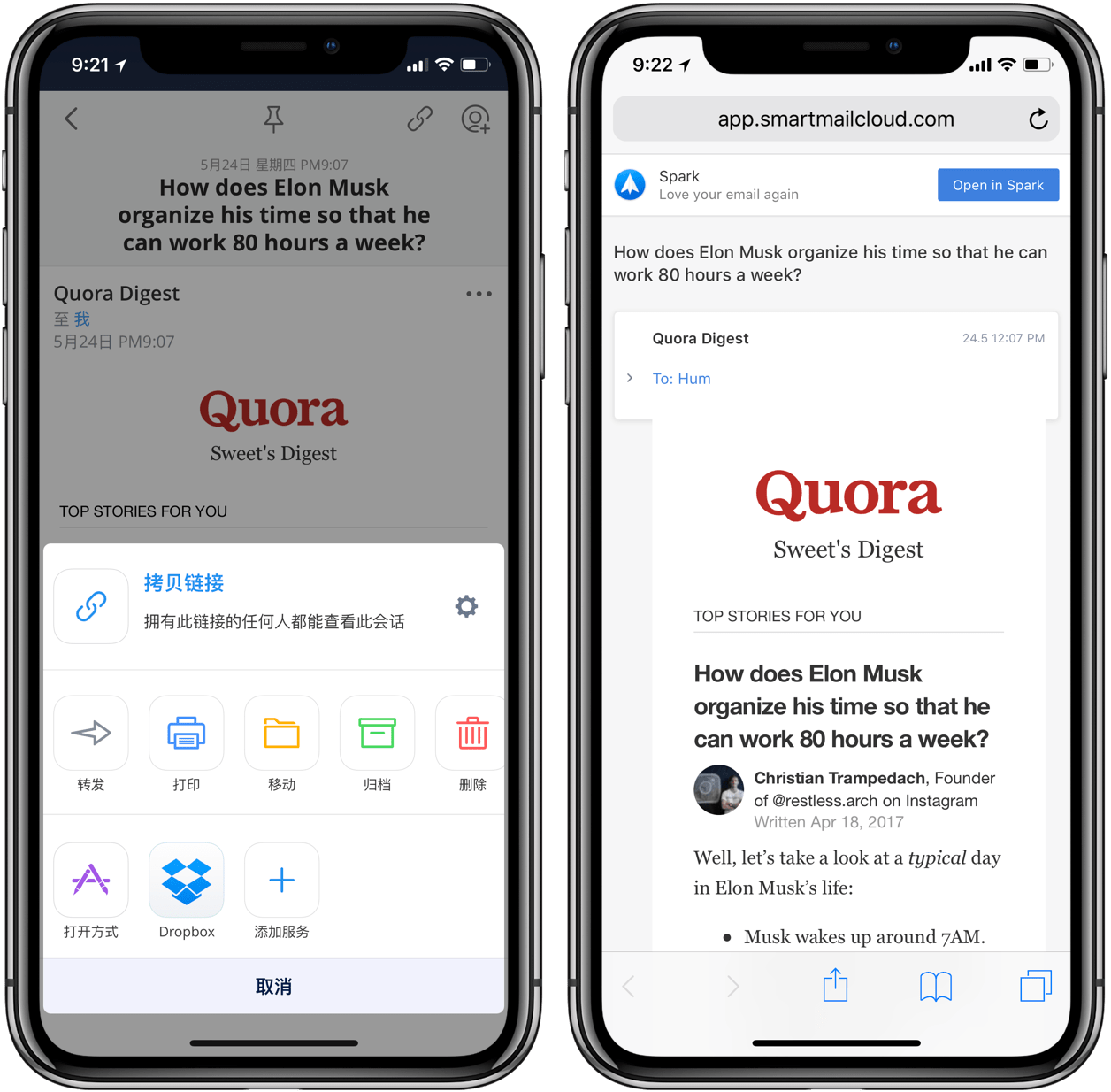 然而 Spark 超越了这个思维,把一封邮件做成了一个 Web 界面,生成了这个 Web 界面的链接。我们可以看上图中,Airmail 的链接是 airmail: 开头的,但 Spark 的链接是 http: 开头的。这样这封邮件我们就可以分享和展示给任何人。与此同时,它还利用了 Universal Link 这项技术,当这个邮件是我们自己 Spark 中的邮件的话,就可以直接将其在 Spark 中打开,进行回复。