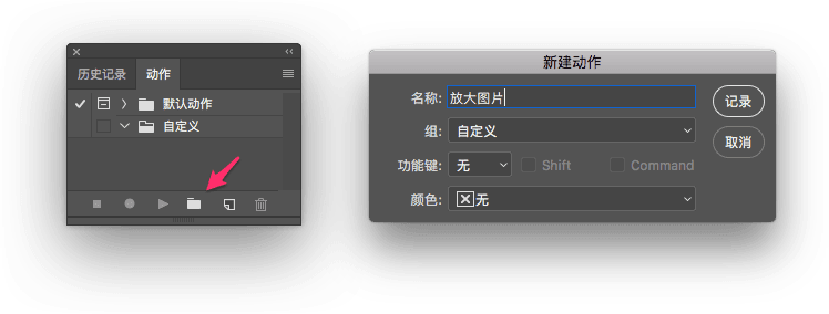 点击倒数第二个文件形状按钮新建一个动作,如上图命名好、选好所属文件夹;