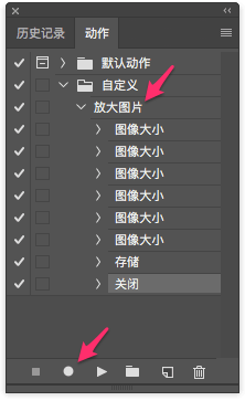 接下来开始录制动作内容。点选刚刚创建好的「放大图片」动作,再点击最下方第二个圆形按钮开始录制。