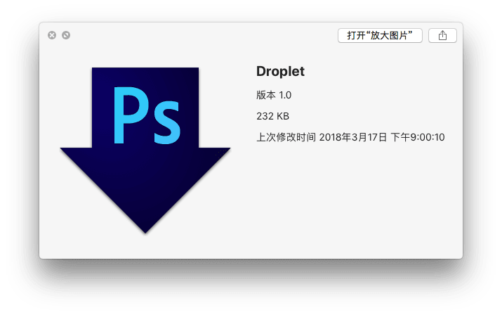 此时我们就得到了一个批处理的 App,在预览工具中它的名字会显示成「Droplet」,顾名思义,就是可以把图片拖到它上面进行处理。