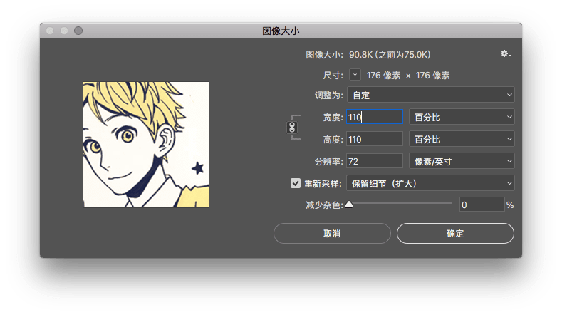 图像 - 图像大小:将宽度设为 110%,勾选「重新采样」,选择「保留细节(扩大)」。这一操作重复了很多次,因为每次都会进一步提升图片清晰度;