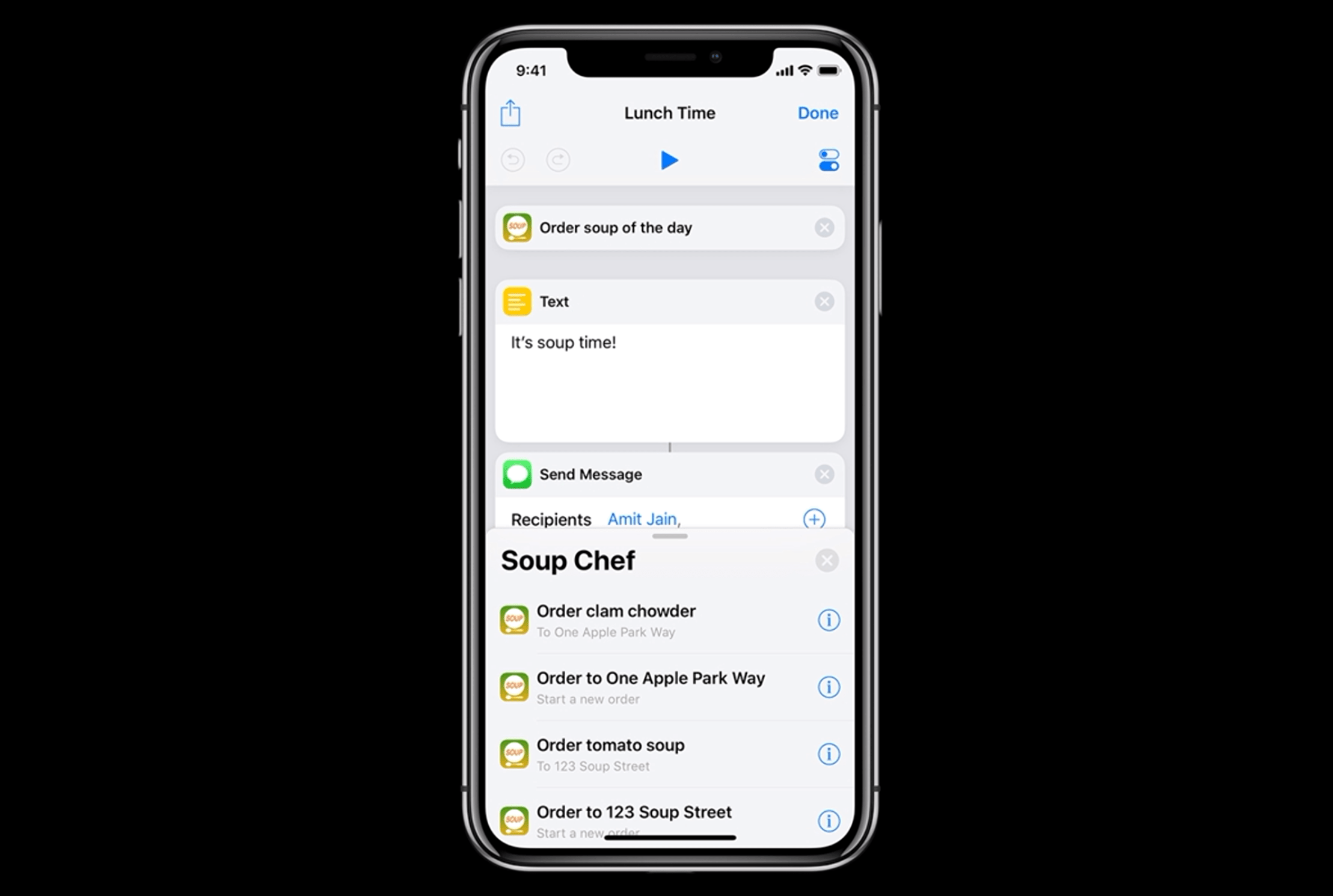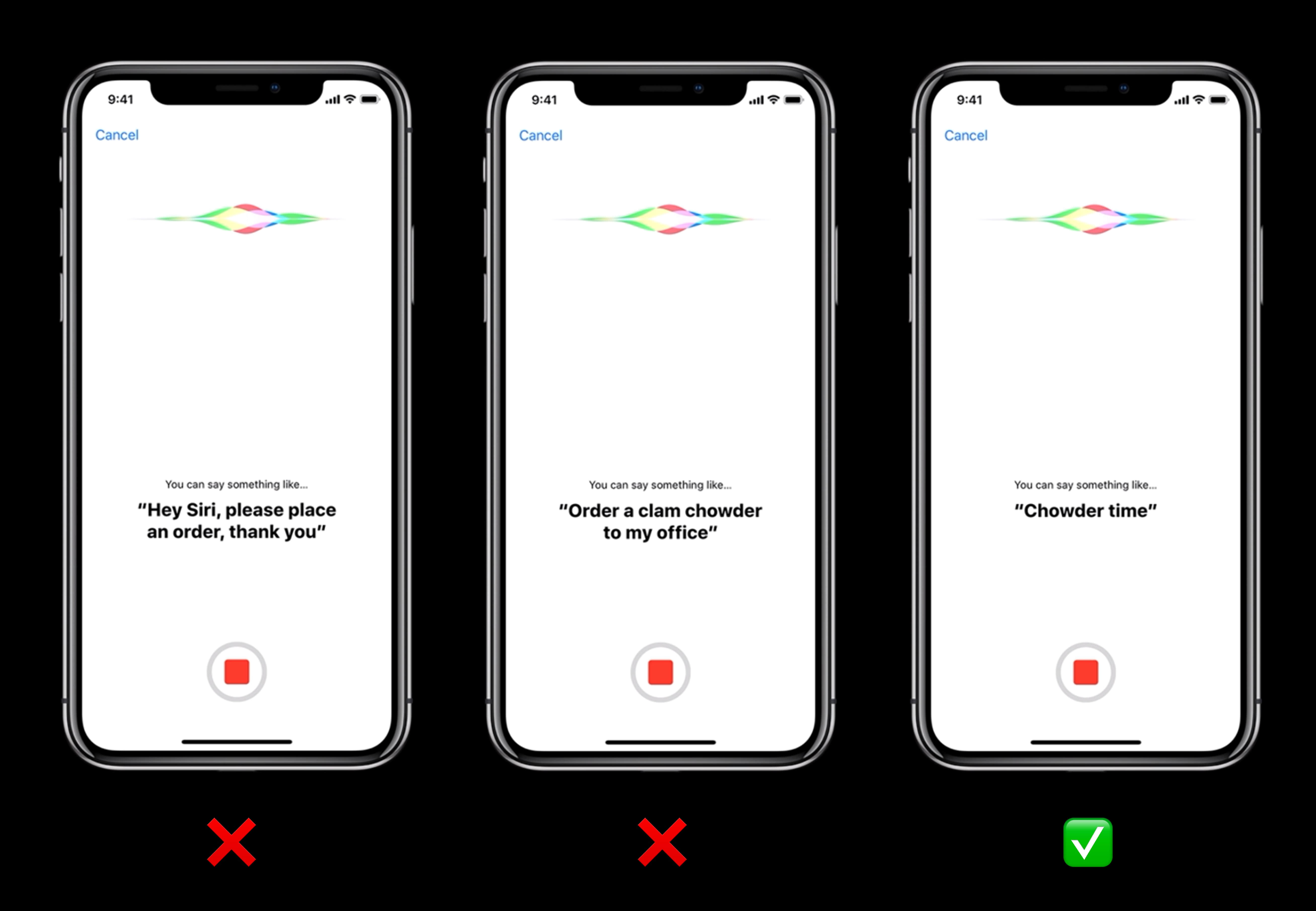 在 Building for Voice with Siri Shortcuts 这场 WWDC Session 上,苹果对自定义短语的建议是使用简短的、容易记住的短语。他们举了一个例子,当你想用 Siri Shortcuts 订一份海鲜汤外卖时,既不应该用「Hey Siri, please place an order, thank you」这种指向不明的句子,也不应该用「Order a clam chowder to my office」这种稍显冗长的句子,而是应该用「Chowder time」这种简短直接的短语。 Siri Shortcuts 的自定义短语应该尽量简短直接