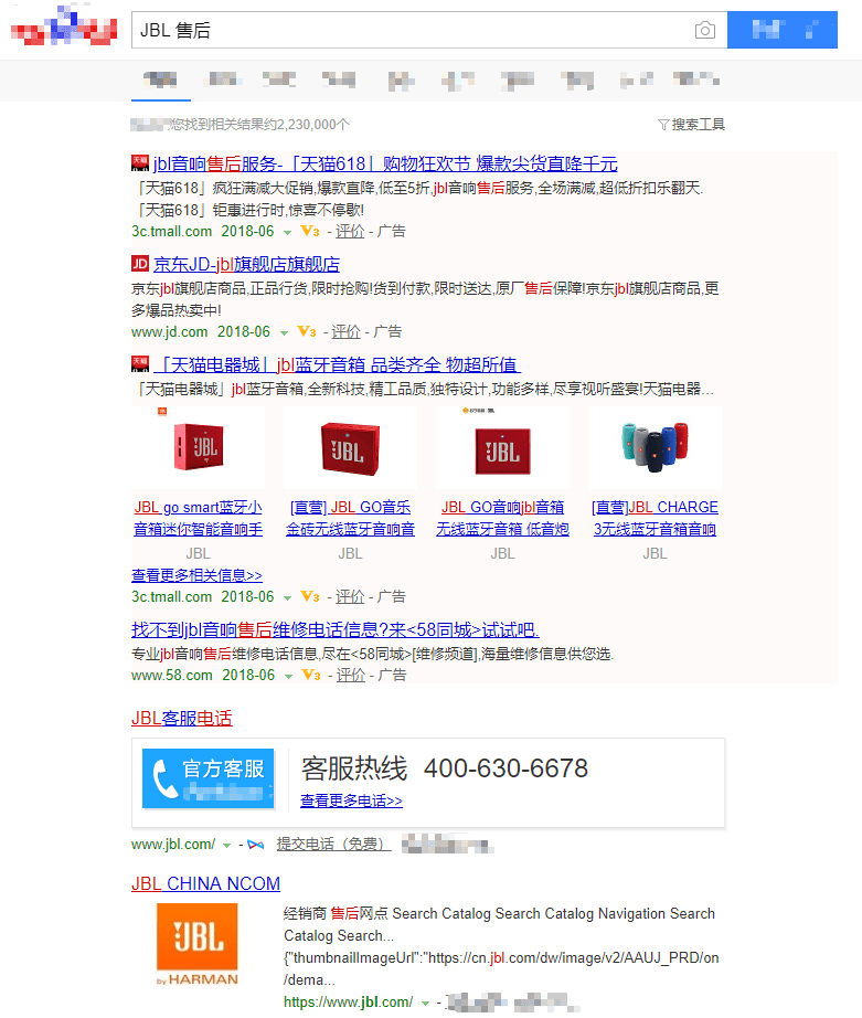我在全新的,没有登录过百度账户的 Chrome 浏览器上开着隐身模式通过它搜索关键词「JBL 售后」,「3.5mm 耳机插孔接触不良」等关键词;