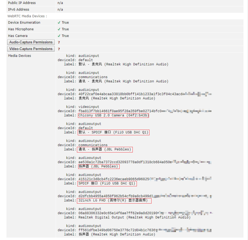再看看下面这张图,清楚地暴露了我整个桌面的配置:USB 摄像头,飞傲的耳机功放,JBL 的音箱,32 寸的 LG 显示器加上所有设备的设备 ID。