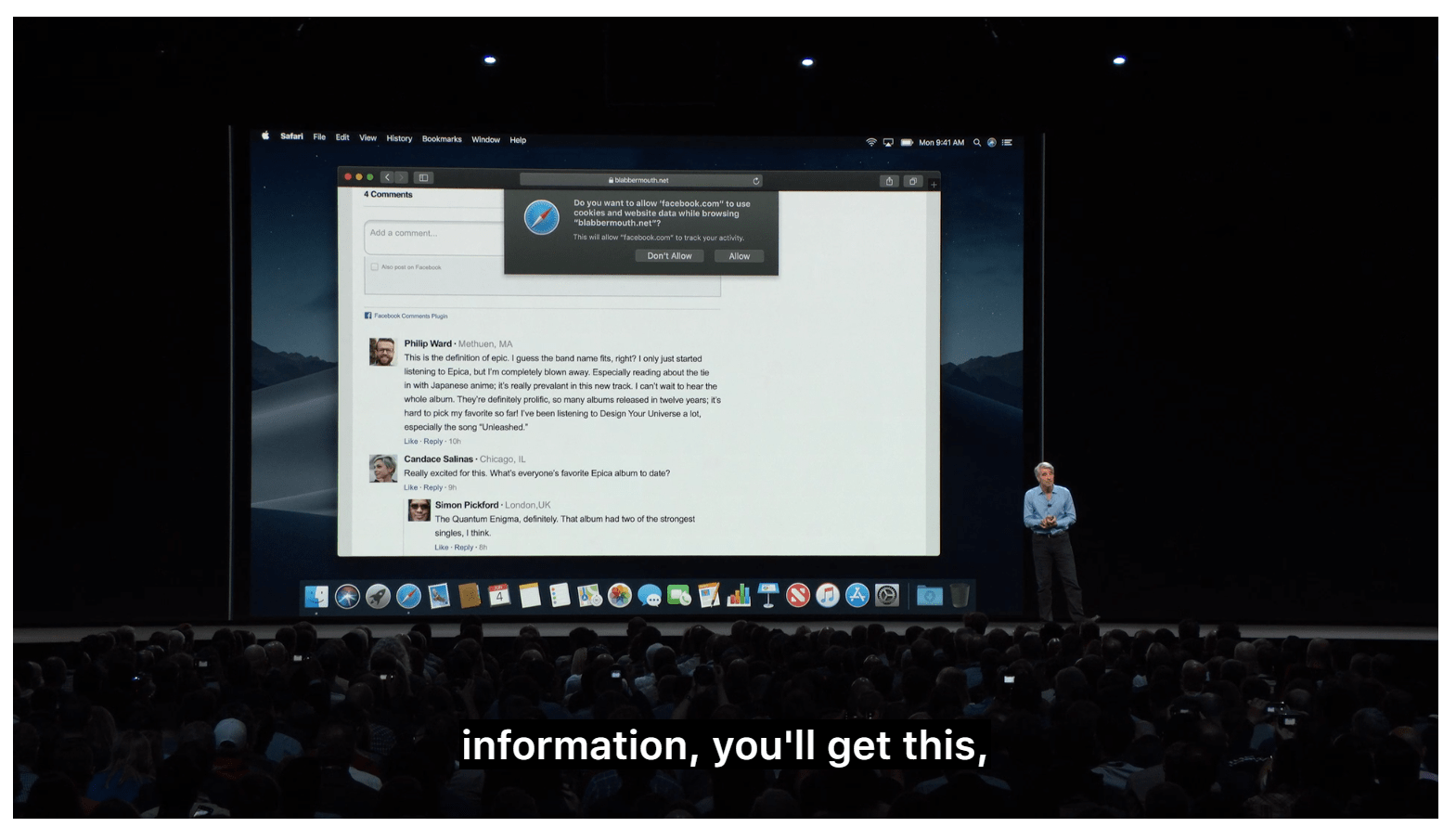苹果当然也认识到了这些技术给他们用户带来地信息安全威胁,作为以安全与尊重隐私闻名的苹果,它们的工程师怎么会对此置之不理呢,所以在 WWDC2018 上苹果宣布了新系统 MacOS Mojave 上地安全措施可以抵御 Fingerprint 和其他攻击手段。