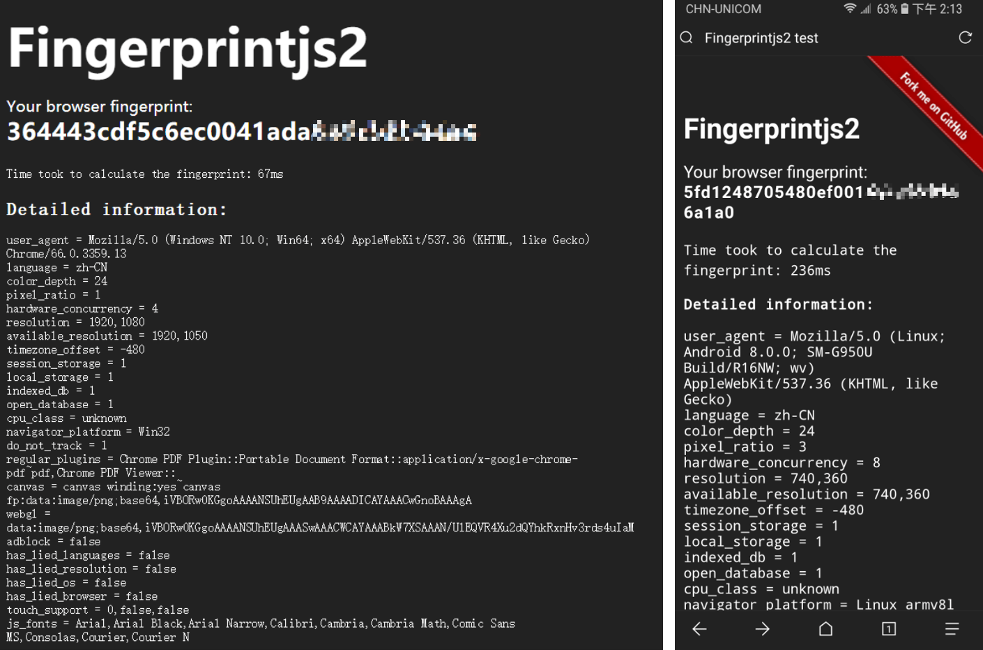 如此「实用」的技术在 Github 上自然少不了开源库啦,Fingerprintjs2 就是人气最高的一个 Fingerprint 生成库。 通过它提供的测试地址,我们可以自己测试各种数据的变动会对 Fingerprint 的生成造成什么影响。下面是我的电脑与手机分别开关隐身模式 + Cookie 产生的 Fingerprint。