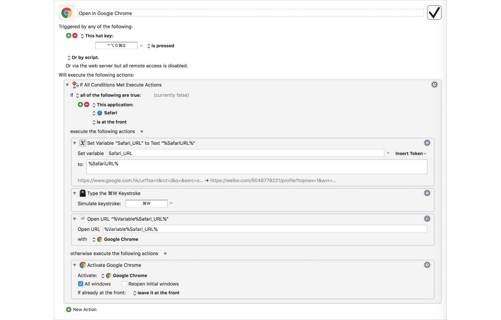 用 Chrome 打开当前网页的 Keyboard Maestro 动作