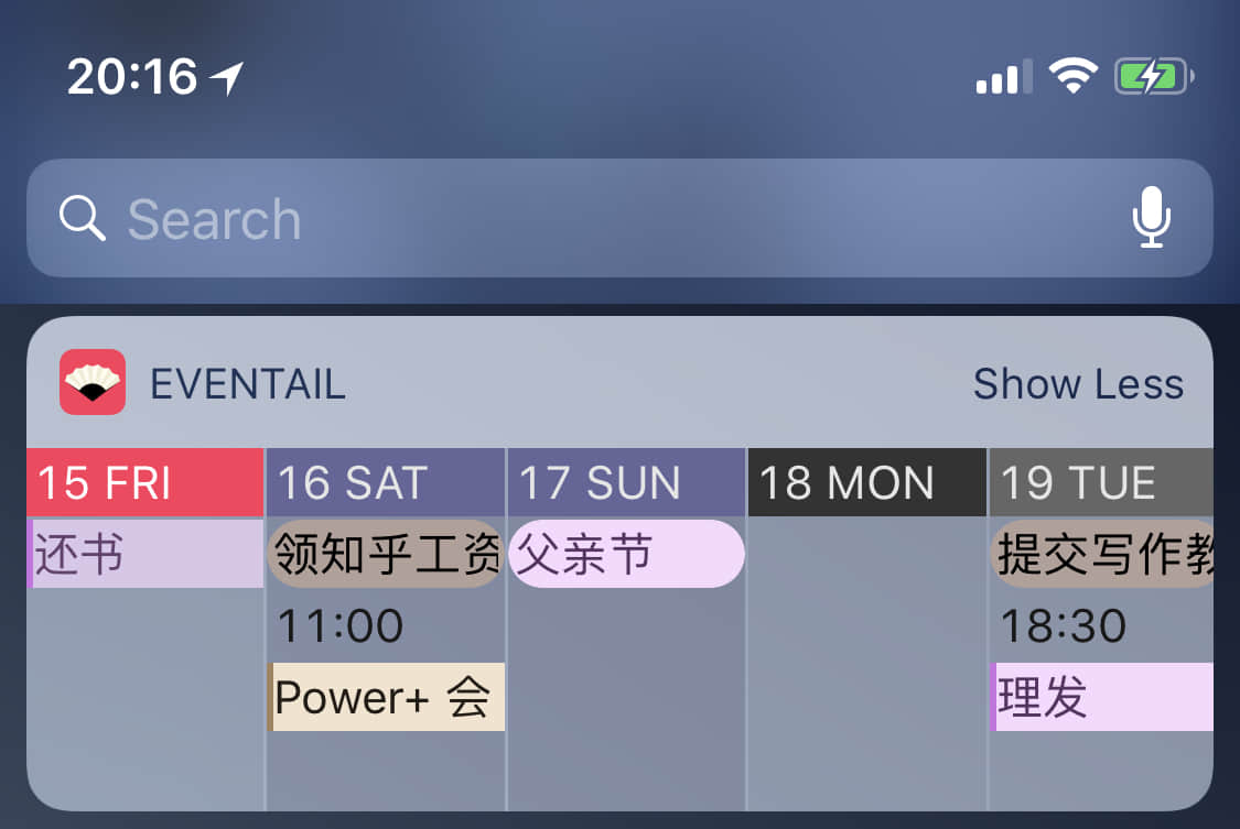 所以一直以来我的 Today Widget 在日历展示软件上没有很好的选择,直到我发现了 Eventail。 Eventail 在 Today Widget 中的样式