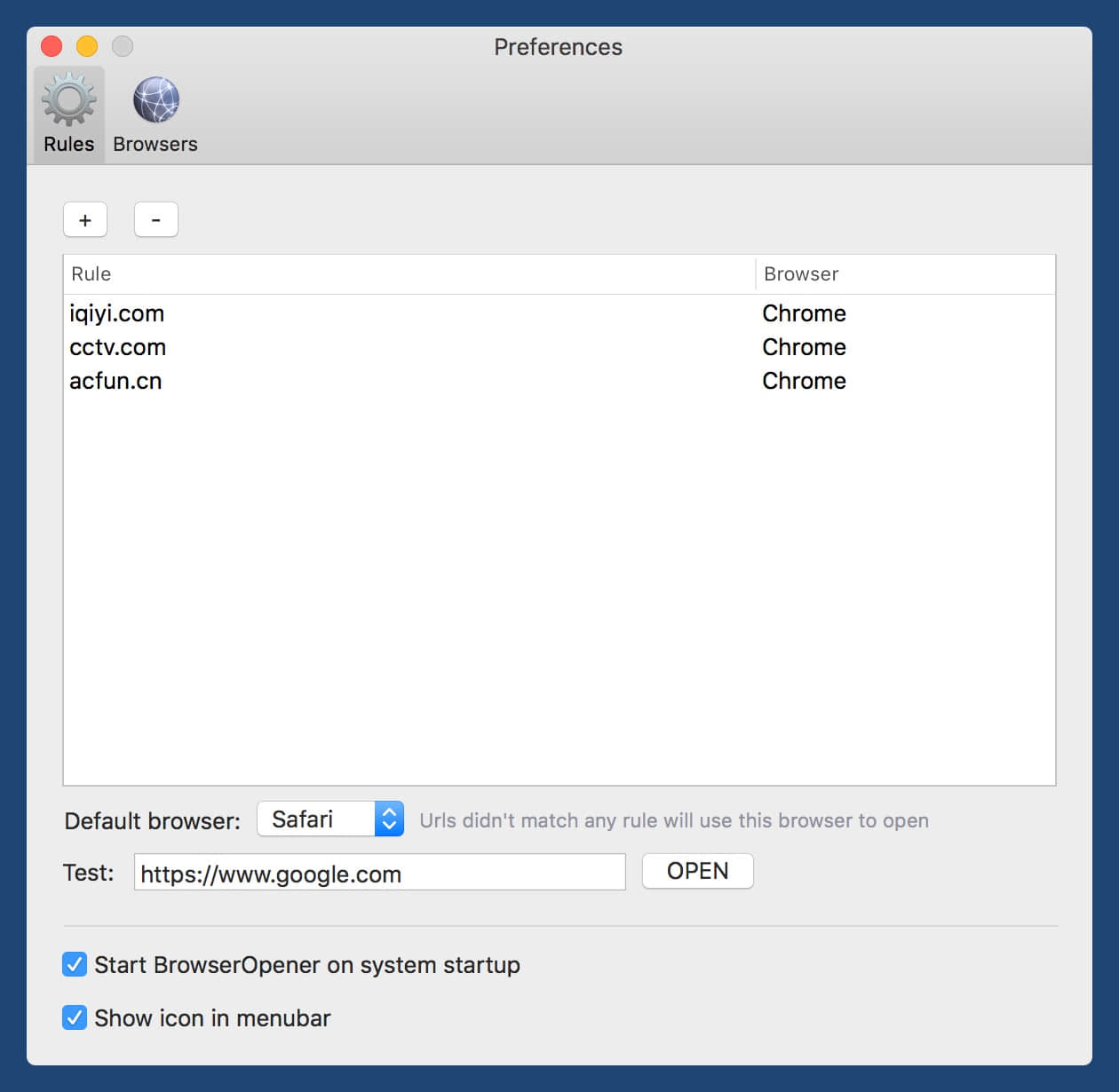 本文要介绍的小工具,主要解决第二个问题。这个工具的名字叫 BrowserOpener,最近刚上架 Mac App Store 不久。 BrowserOpener 的原理很简单,它首先会把自己设置为系统默认浏览器,然后通过添加规则点开的链接用什么浏览器打开。