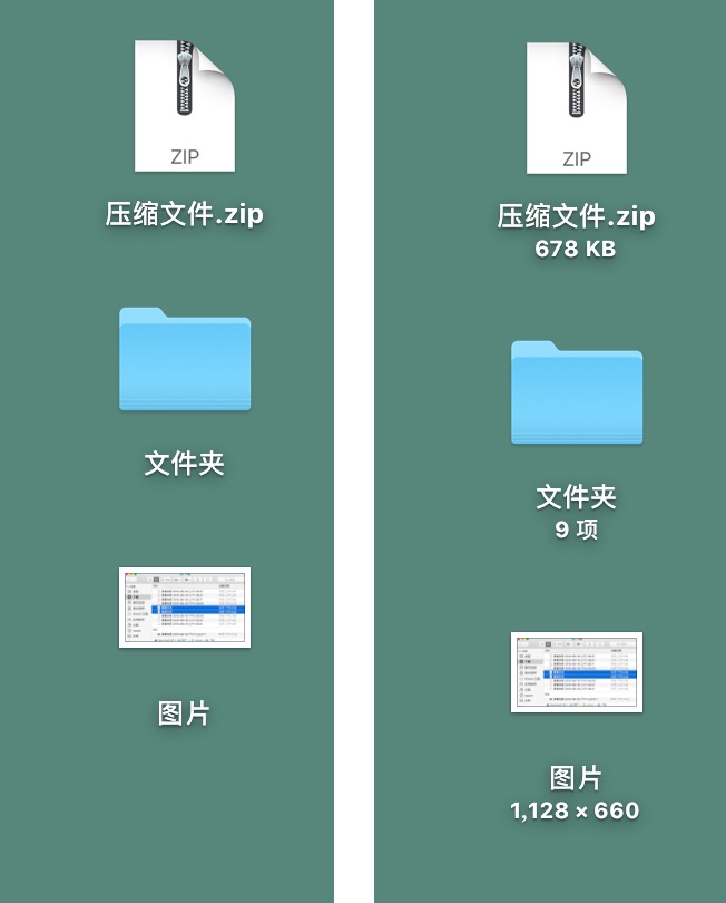 此外还有一个非常建议大家打开的选项,是「显示项目简介」,适用于桌面和图标视图。打开后,我们就可以直接通过图标信息预览到图片的分辨率、压缩文件的体积大小、文件夹内的文件数量,而不需要频繁通过「右键 - 显示简介」(⌘Command-I)来查看这些信息。