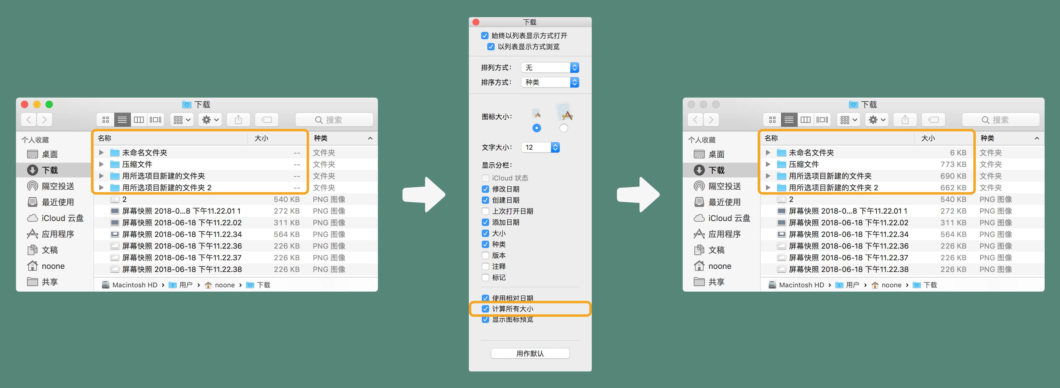 在列表视图下,我们可以看到设置选项稍微有些不同。其中有一个叫做「计算所有大小」的选项也很推荐打开,打开后可以看到文件夹的大小,在这之前是无法直接查看的。