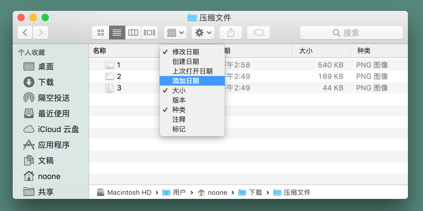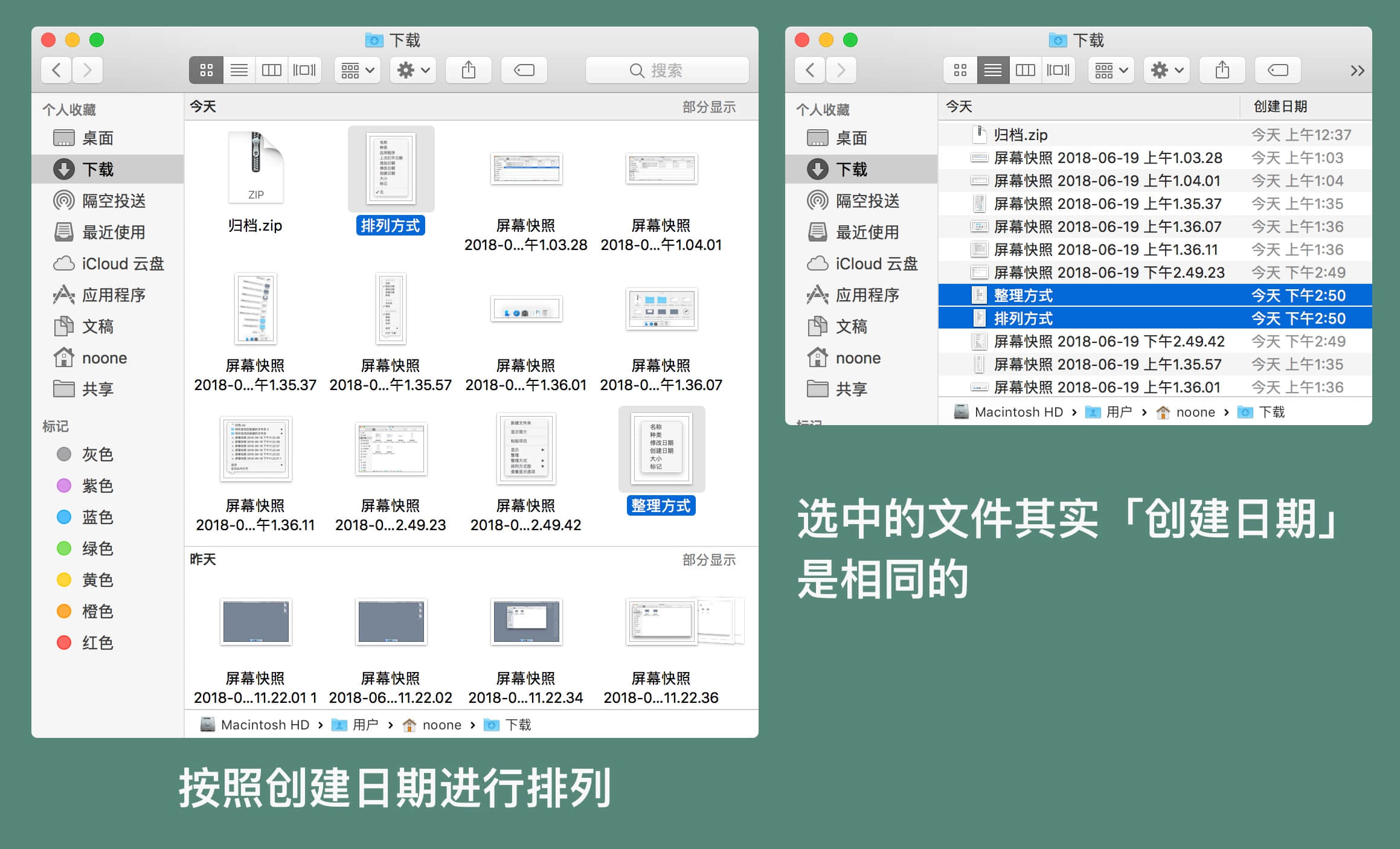 大家用得比较多的文件排序方式应该是「修改日期」和「创建日期」,但是我个人最常用的排序其实是「添加日期」。它和前两者的区别是: