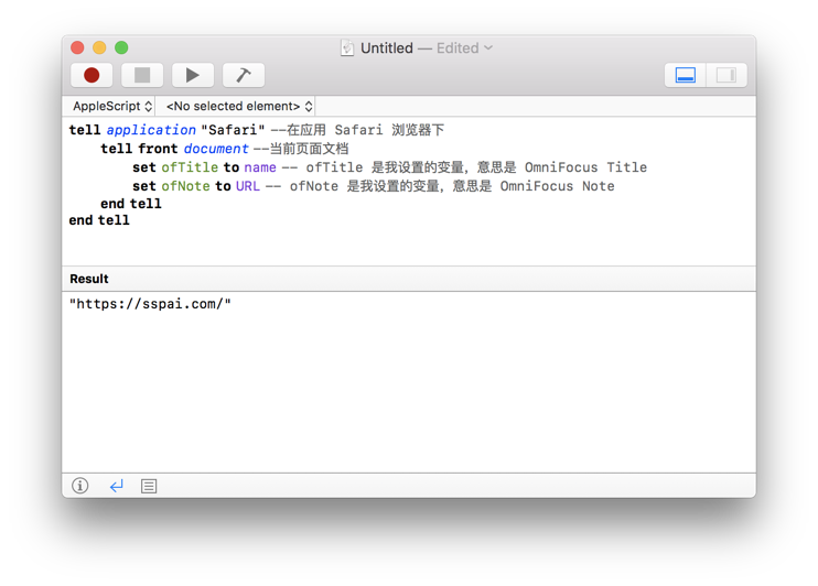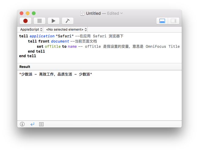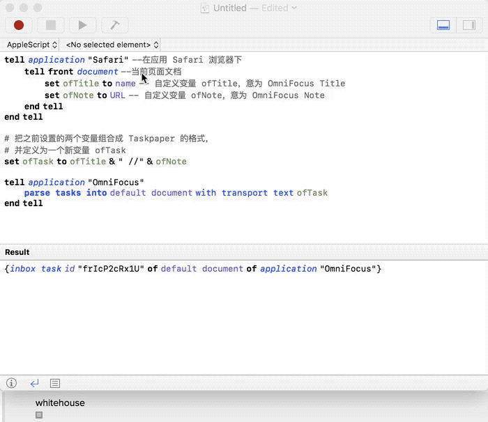 我们可以通过一个具体的例子来看如何使用脚本词典:以一定的格式发送当前的 Safari 页面到 OmniFocus。因为我利用 OmniFocus 来做「稍后阅读」,需要能以下面的格式发送当前 Safari 页面到 OmniFocus 中:将页面标题作为 OmniFocus 里一项任务的标题,并将页面网址作为这个任务的 Note,