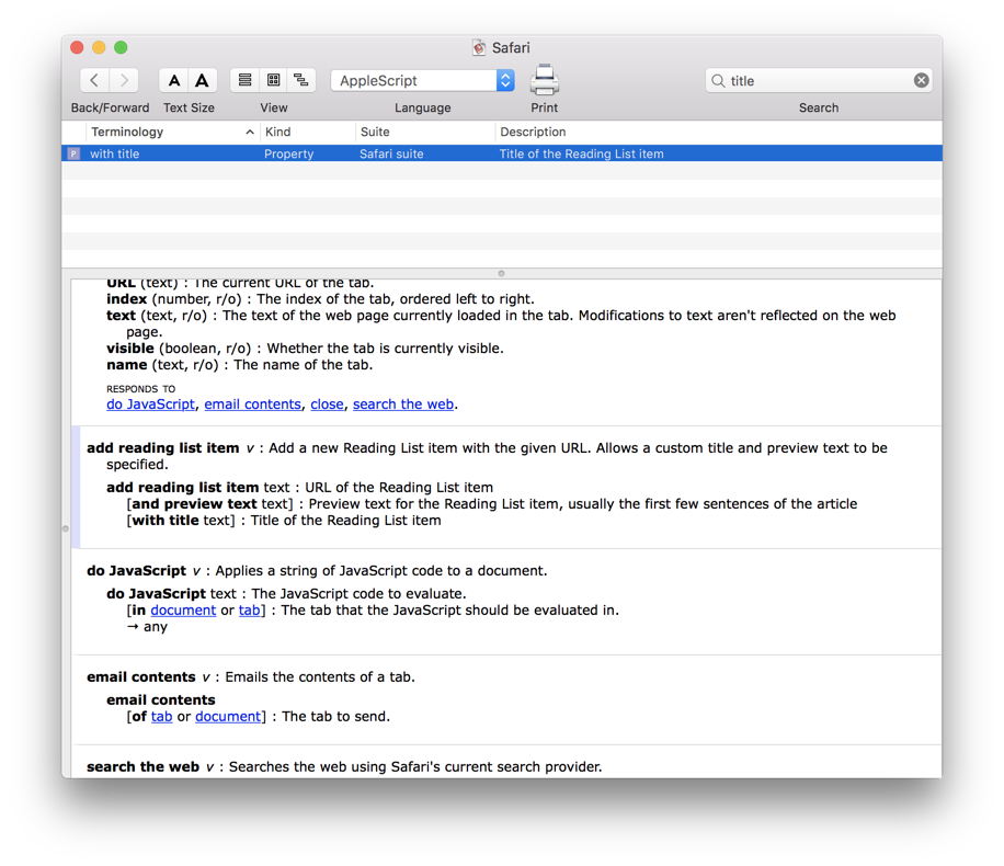 我假设 AppleScript suite 一定提供了当前 Safari 页面的标题和网址的类,所以我打开词典在右上角的搜索框里首先搜索一下「title」(也就是标题)。它给出了以下结果: