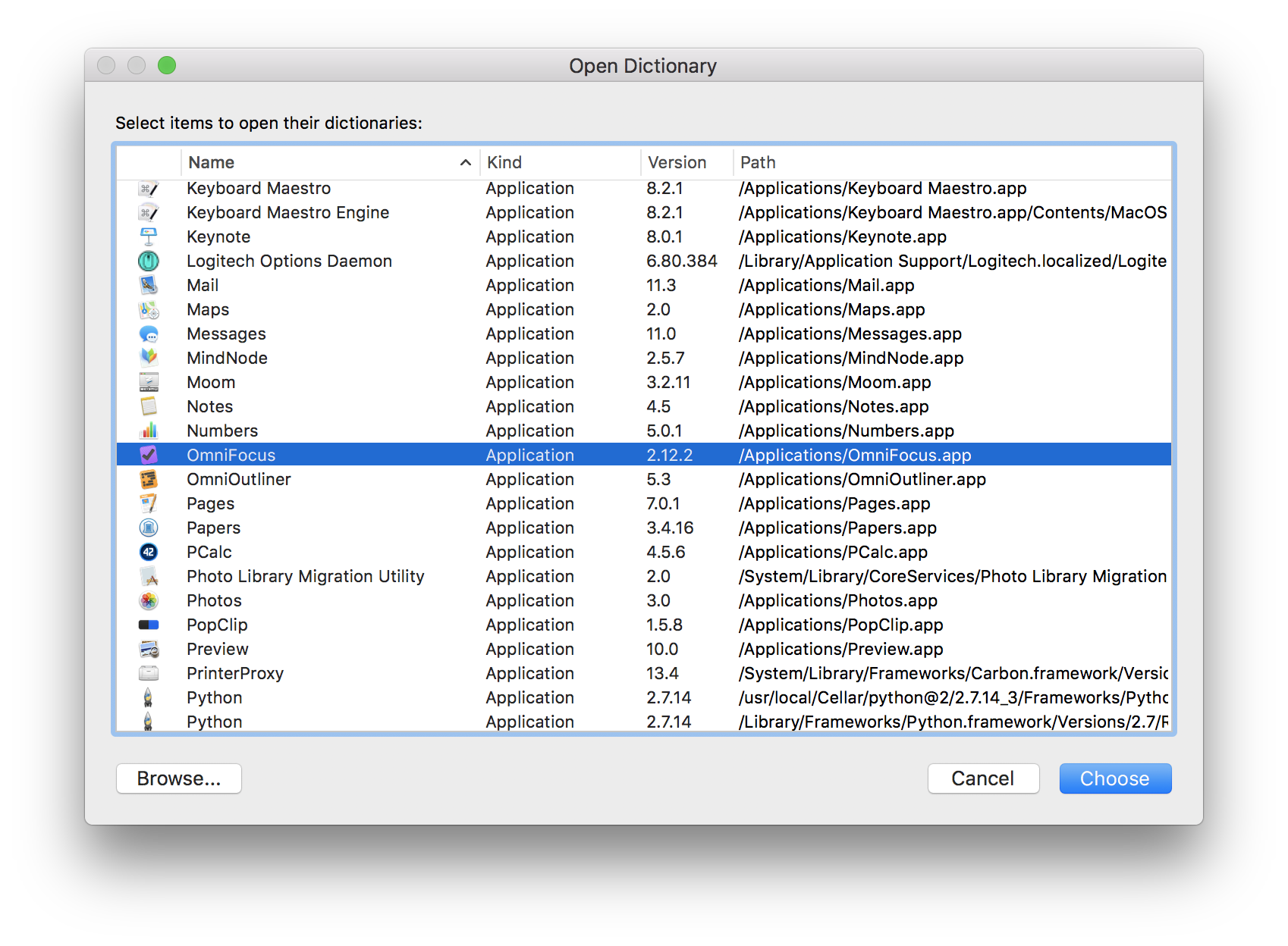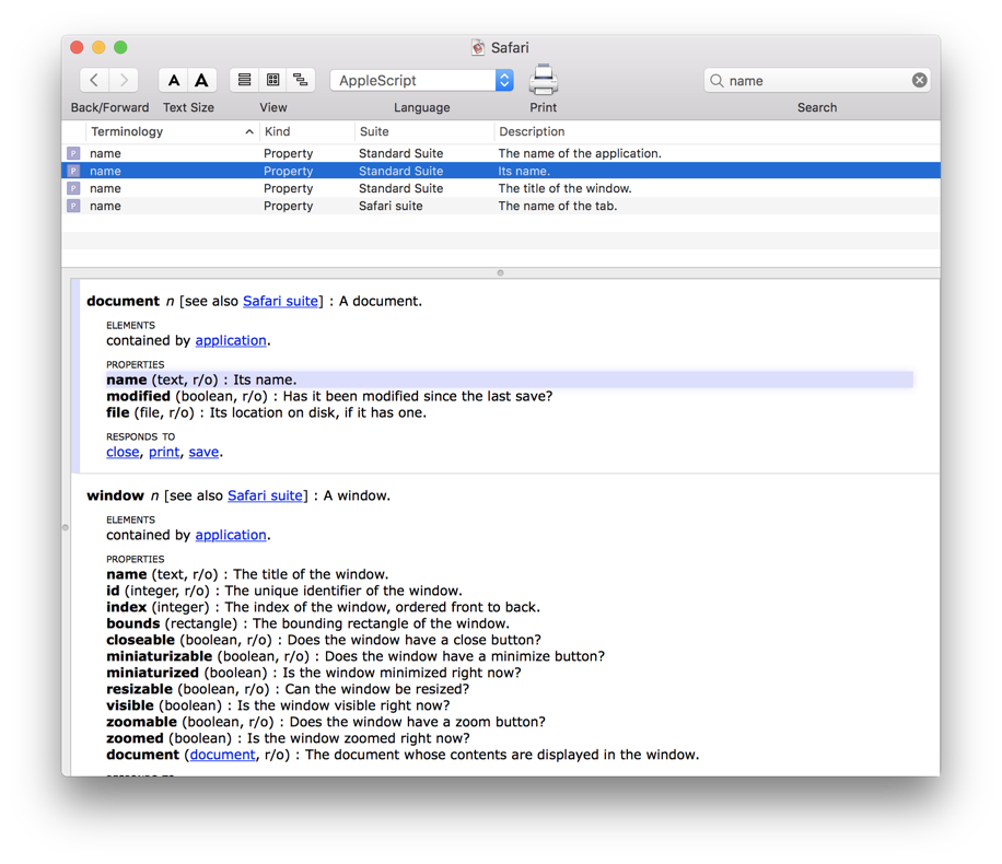 系统原生的脚本词典:打开「脚本编辑器」 → 新建一个脚本 → 用快捷键 ⌘⇧O 打开 AppleScript 字典(Dictionary),在这里你可以看到你 Mac 上所有支持 AppleScript 的应用的 suite。