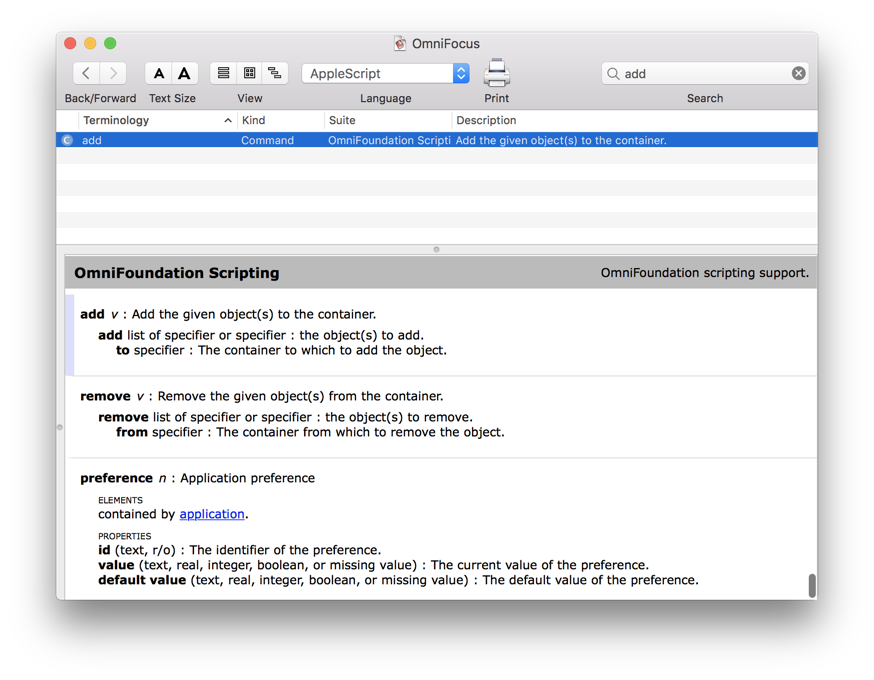 第四步:现在需要添加到 OmniFocus,先查查 OmniFocus suite 里哪个类可供使用,我先搜了一下 add,发现并没有什么好的结果:
