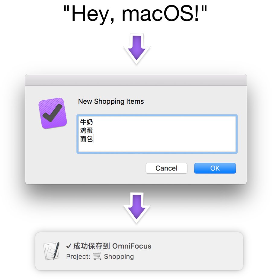 我们可以来看一个例子:往 OmniFocus 的购物清单里添加三项内容,鸡蛋、牛奶、面包,这个需求实际上是我和 macOS 的对话: