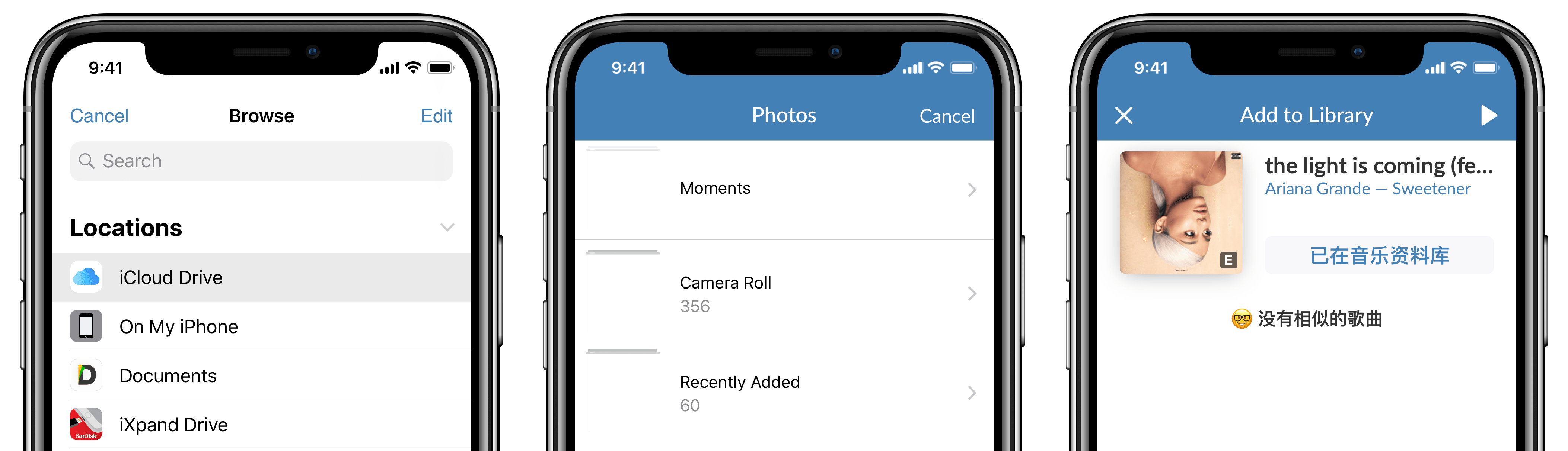 左:JSBox 调用 iCloud Drive Controller;中:JSBox 获取手机相册内容;右:JSBox 获取 Apple Music 资料库