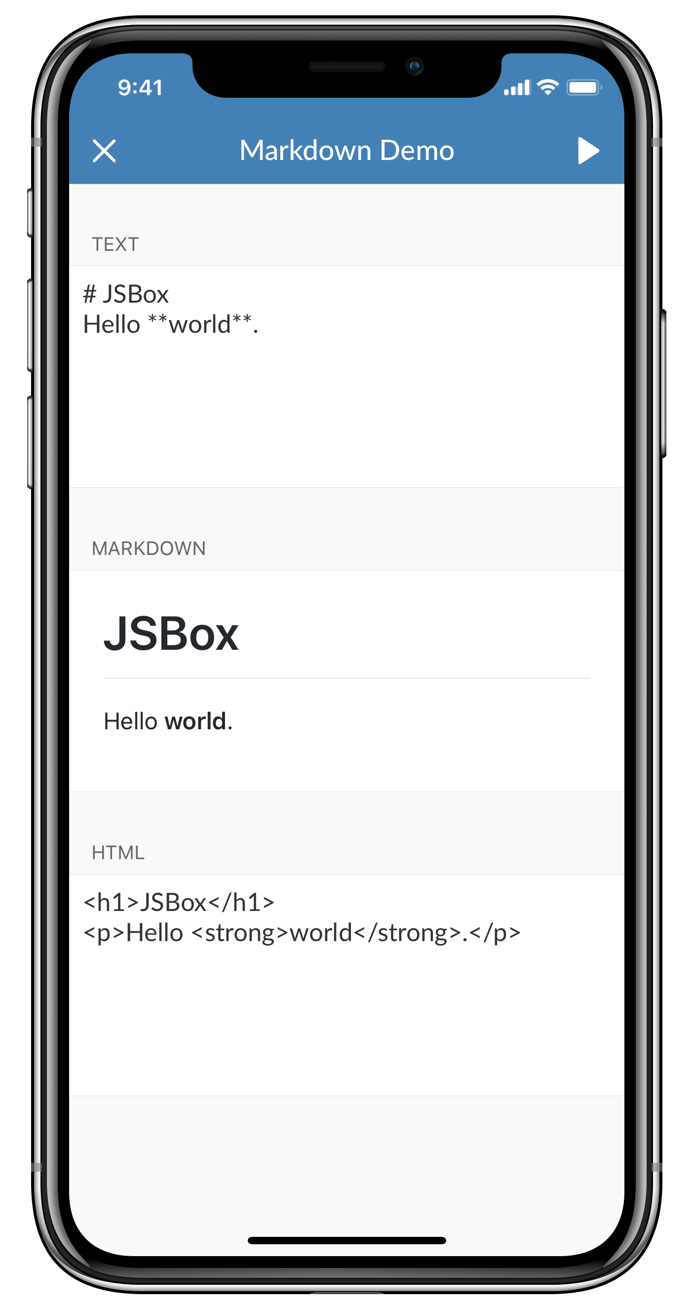 除此以外,受限于环境的特殊性,开发者也不断听取用户的需求和建议,为 JSBox 提供更多实用、便捷的接口。例如 Markdown 相关接口,它可以将输入内容以 Markdown 样式显示出来,也可以进行 HTML 与 Markdown 相互转换,对带样式的文本输入体验十分友好。