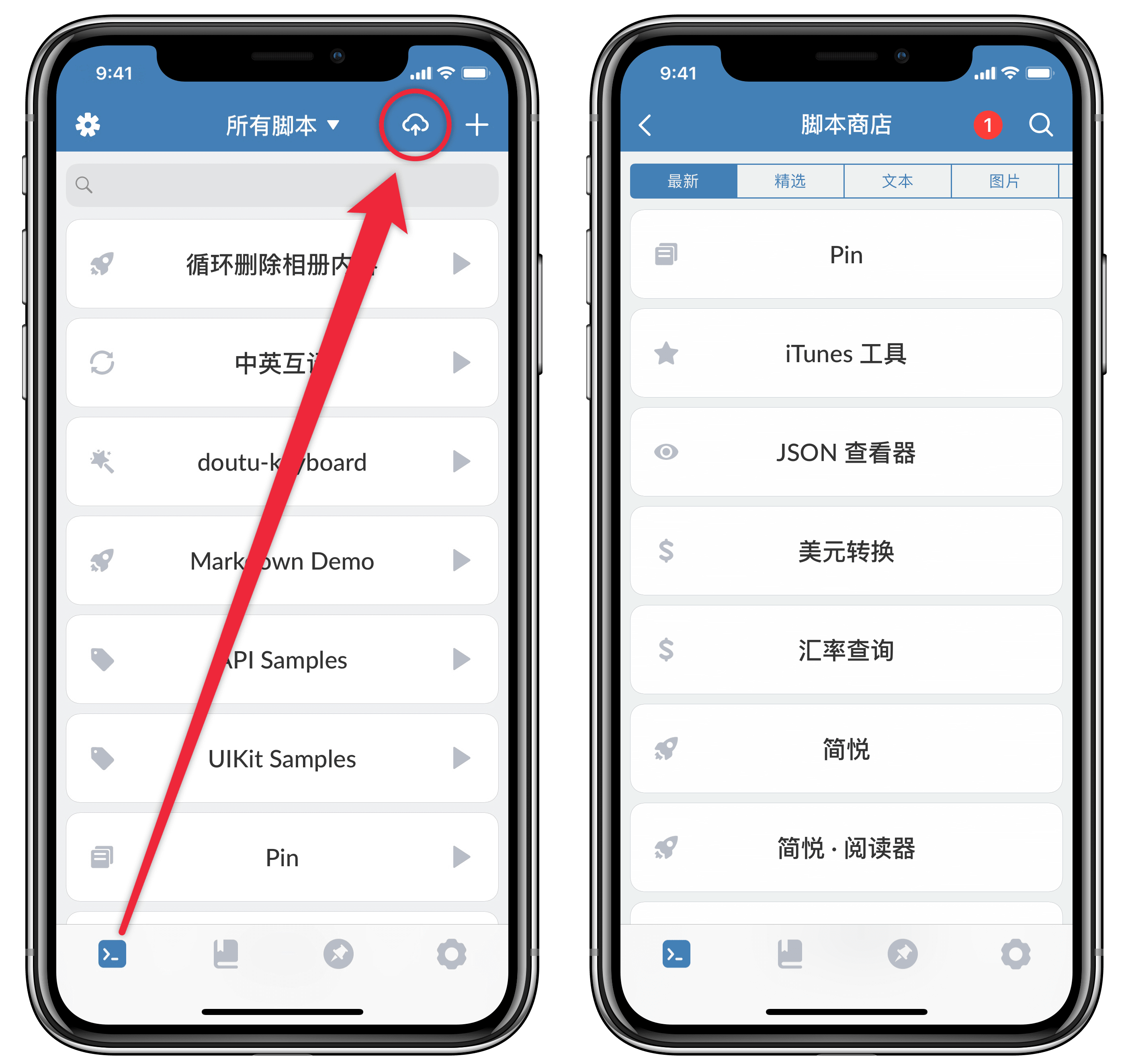 这个「脚本商店」在主应用程序第一个标签页面的右上角云朵图标点击进入,里面「最新」分类可以看到近期最新收录的一些脚本。