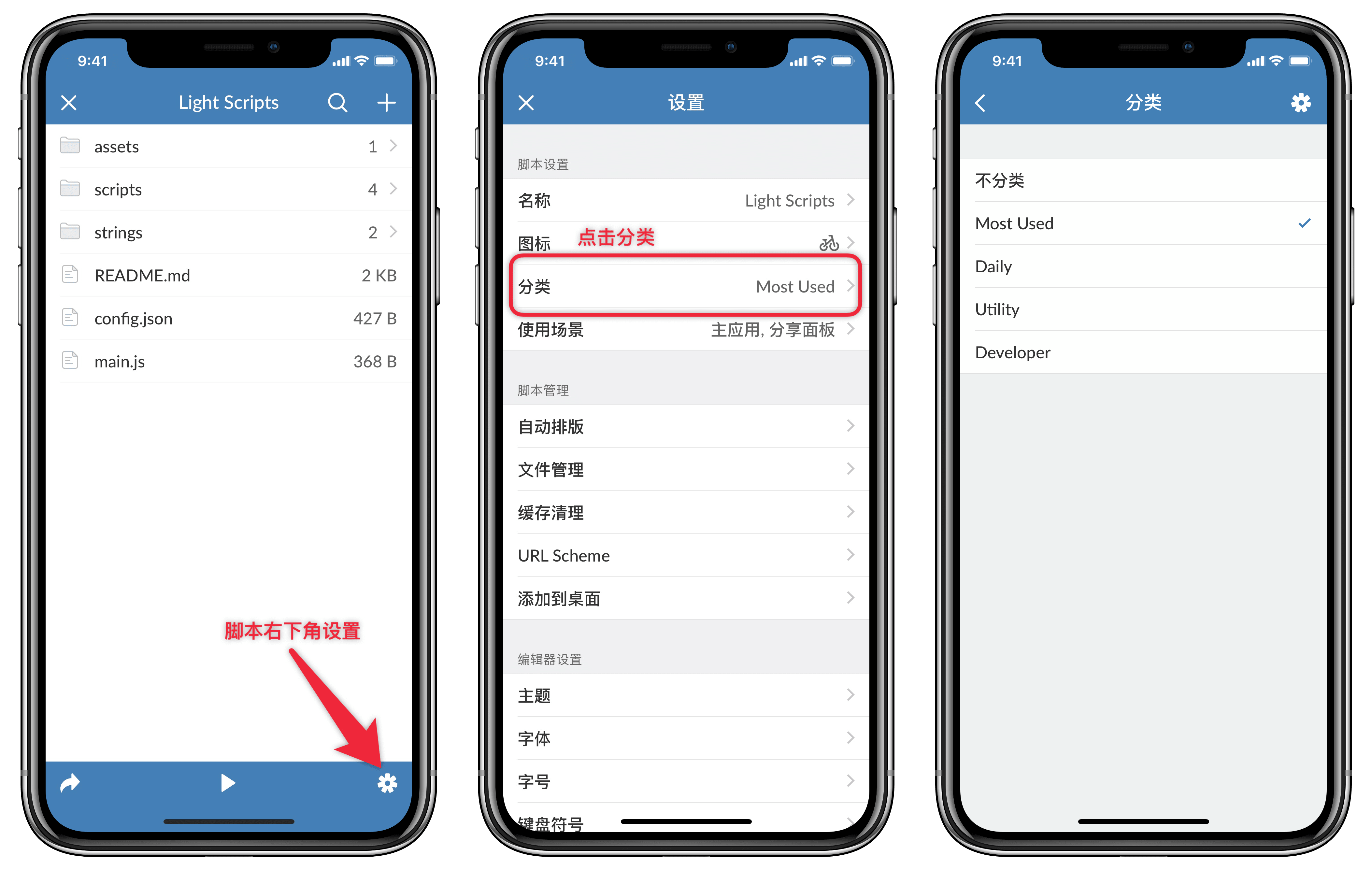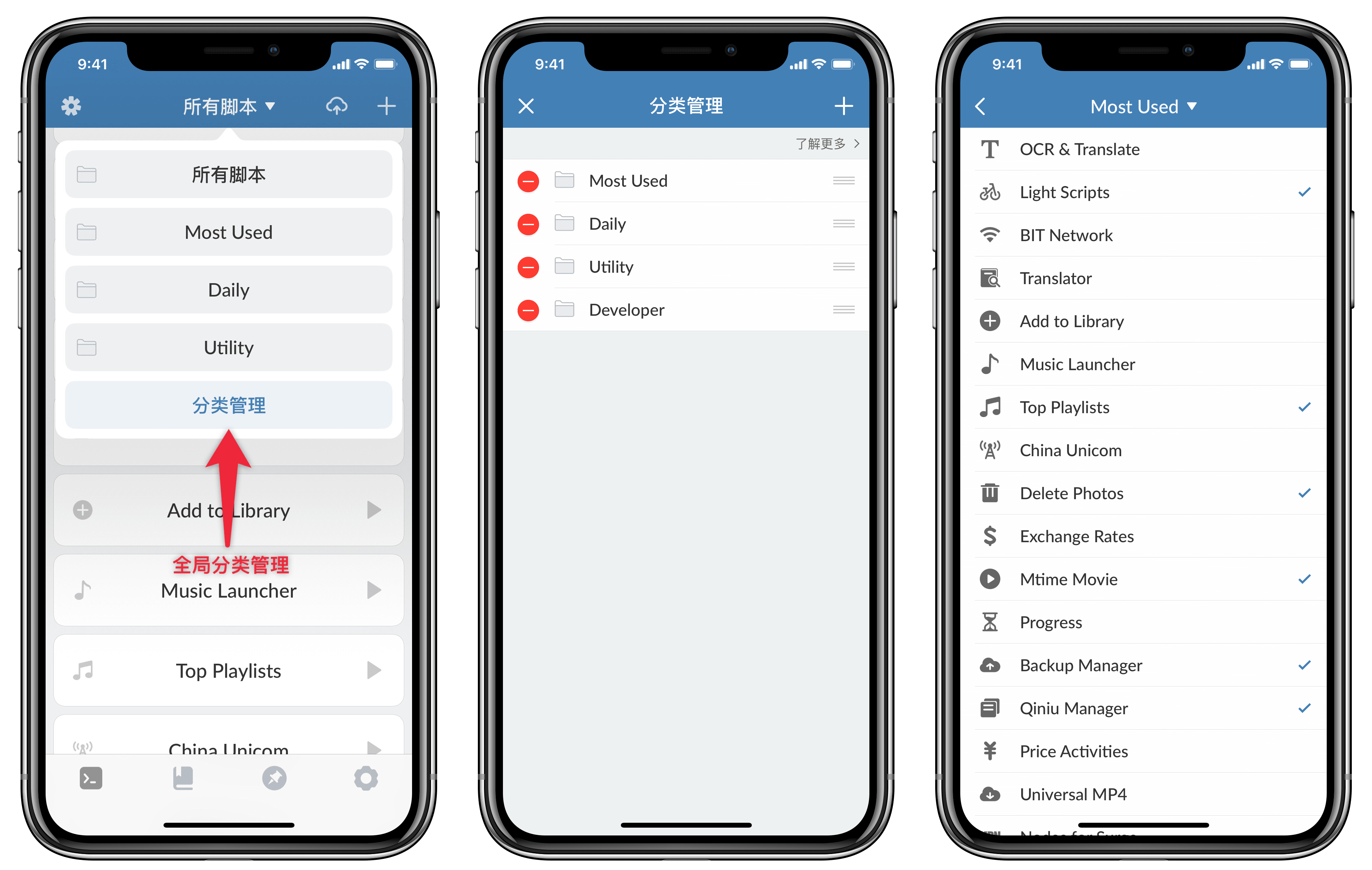 合理设置分类列表可以让常在主应用程序运行的脚本更集中地显示,替代冗长的「所有脚本」列表
