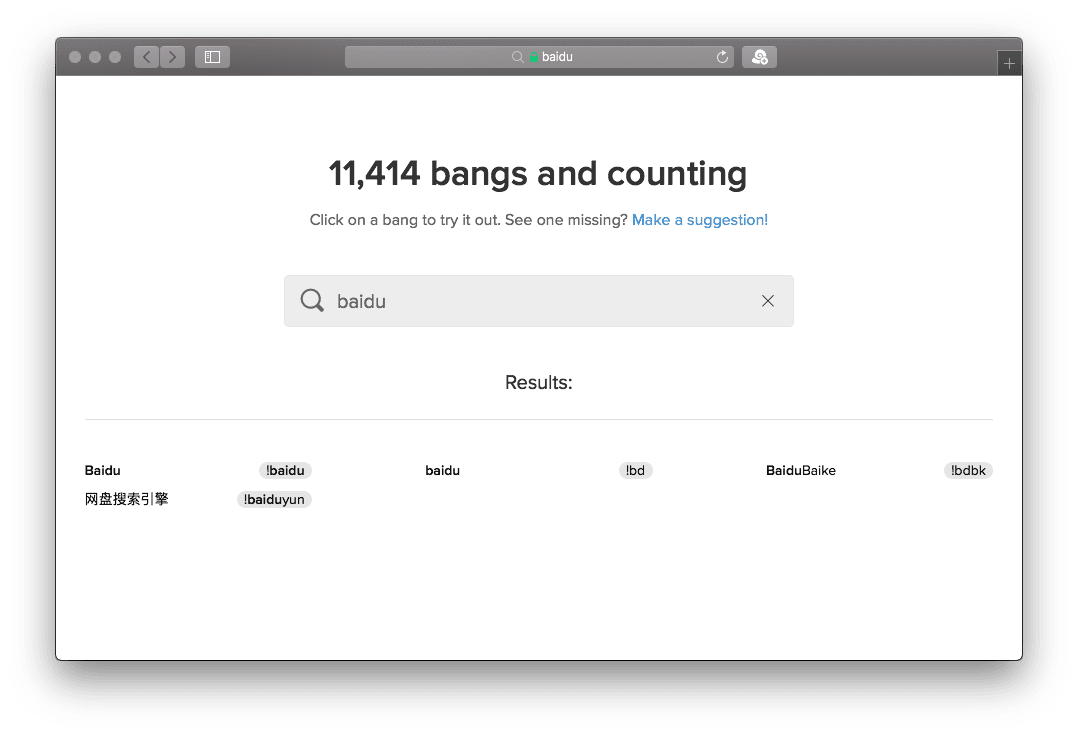 虽然这能够为你定制更个性的搜索结果,但这也可能导致回声室效应,让你以为自己看到的搜索结果就是真实的。如果你不希望自己的数据都被搜索引擎记录下来,可以使用 DuckduckGo 的 Bang! 功能。Bang! 的原理就是把关键词交给 DuckduckGo,再由它去指定的网站进行搜索,从而让你保持匿名。 Bang! 为 10000 多个站点提供了搜索 URL,使用方法就和普通的搜索 URL 一样。你可以在 Bang! 里搜到常用搜索引擎的 URL。 Google 搜索的 URL 参数
