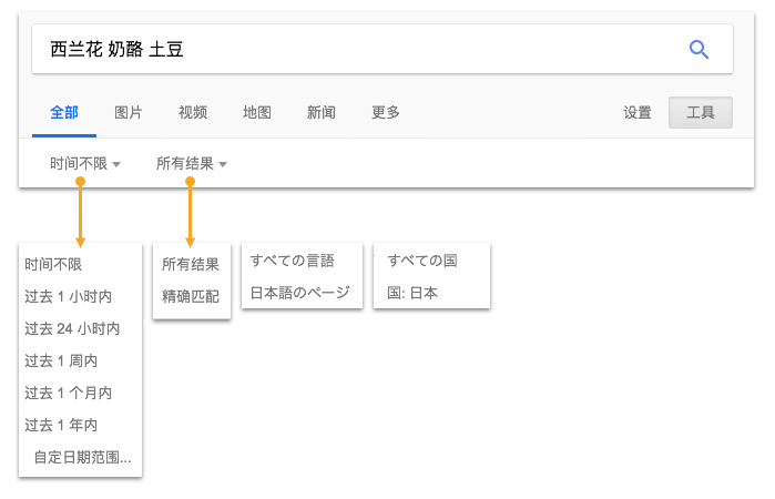 以 Google 搜索为例,它的搜索栏下面就是搜索工具,提供了以下选项: