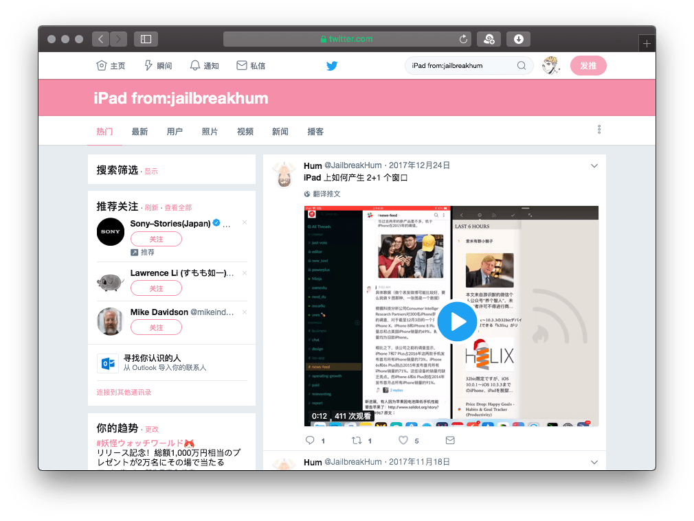 比如用 iPad from:jailbreakhum 就能搜出带关键词 iPad 的、由 Hum 发布的推文: