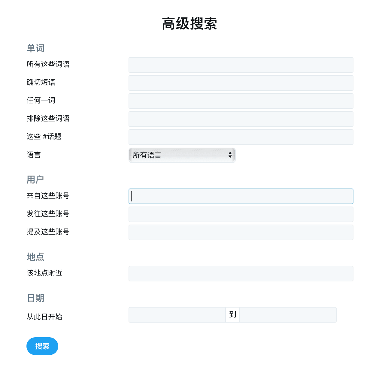 如果你记不住这些语法,也可以使用 Twitter 官方提供的 高级搜索界面。同样可以获得更加精确的搜索结果。 如果你想知道其他工具或网页的搜索语法,也可以搜索 搜索引擎名+搜索语法 来寻找。